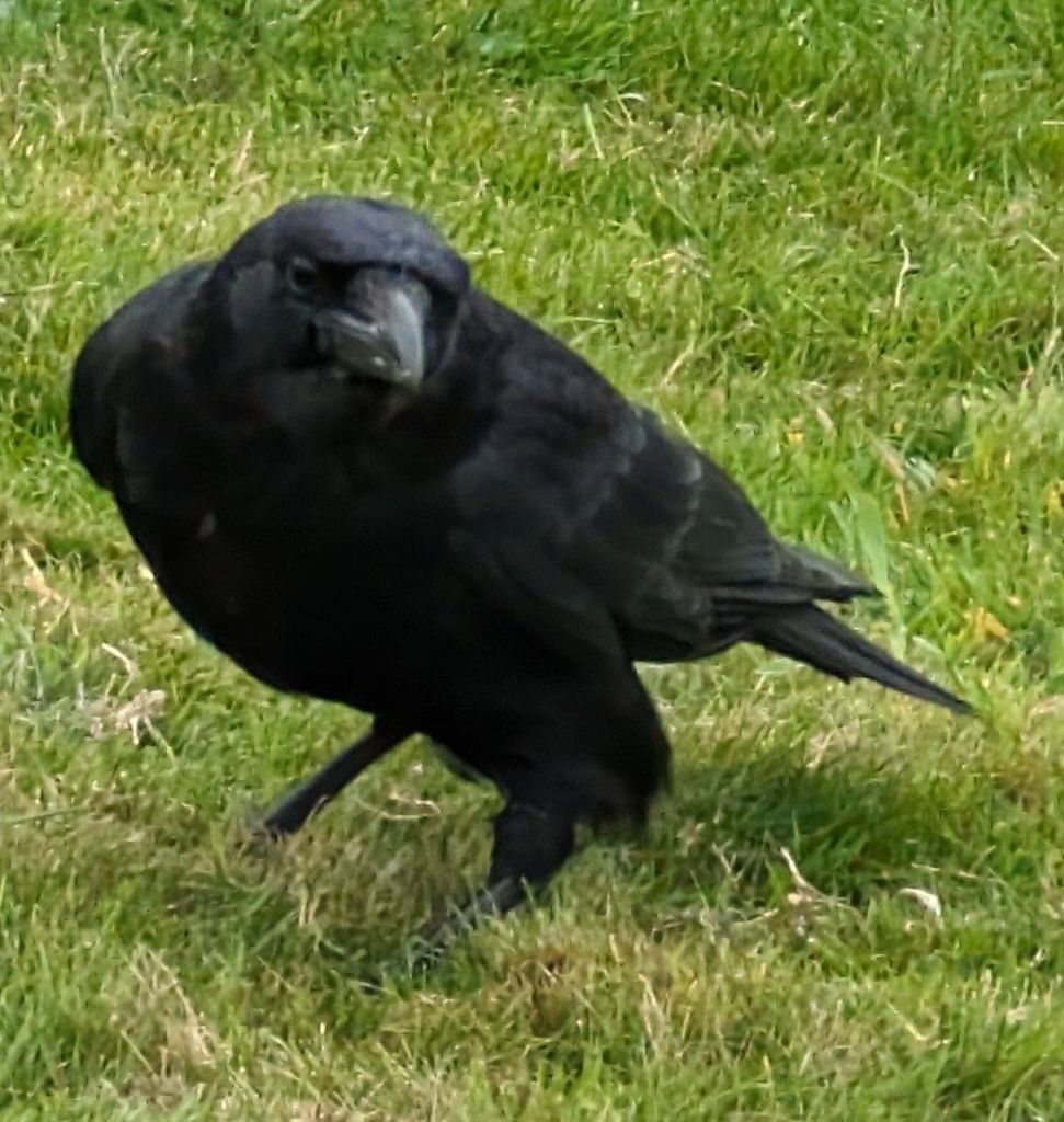 Crows: One feeding on the recreation ground; another joined it after a brief stint in the hedgerow.