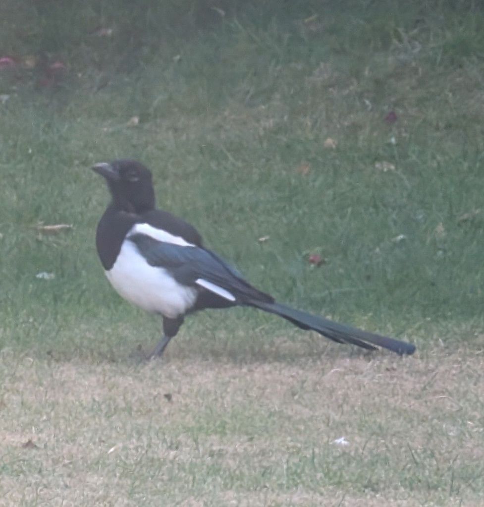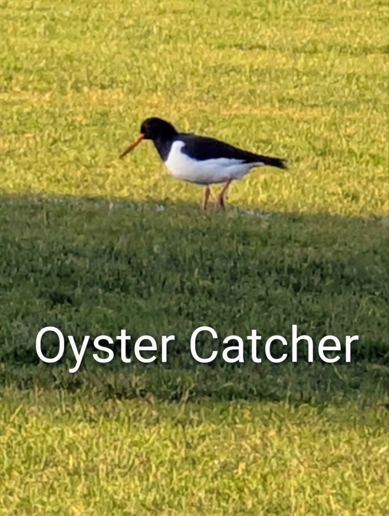 Oystercatcher–Black and white; larger than a magpie; foraging on the grass.