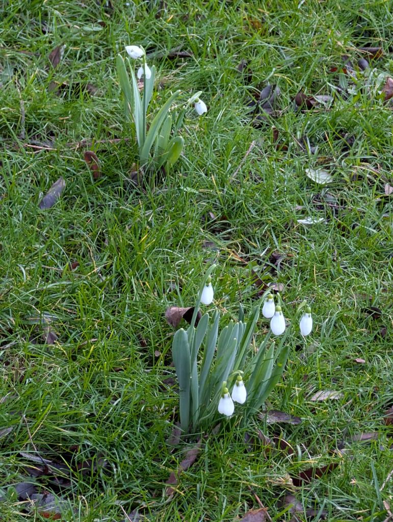 Inside the cemetery, I disturbed three wood pigeons who instantly took off in various directions. I couldn’t resist taking another couple of photographs of the early snowdrops growing near the gates. On the way back, I passed another couple walking a poodle-type dog.