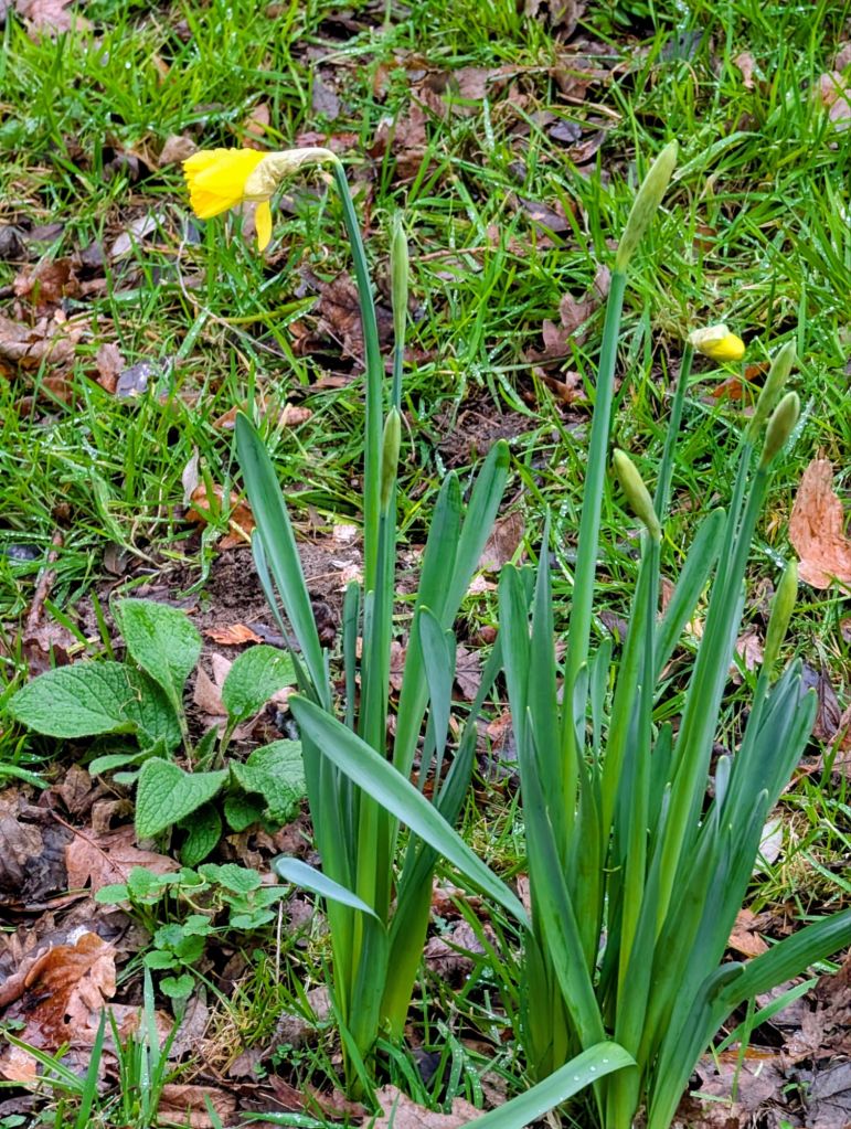 Plants: A single daffodil along the roadside verge, almost in full flower.