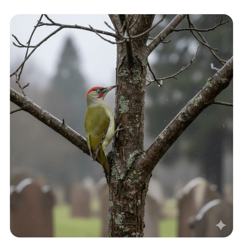 Light rain was forecast, so I set out with an umbrella. The walk became quite unpleasant as the rain and sharp breeze picked up near the cemetery. The highlight was definitely the green woodpecker; its flash of colour was unmistakable even in the overcast conditions. Had to raise the umbrella for the final stretch toward the leisure centre as the rain turned heavier.