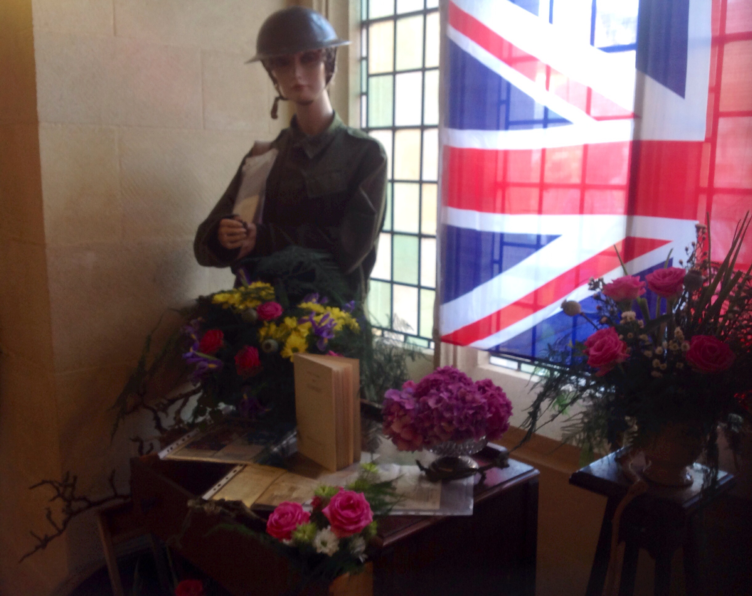 An interesting nationalistic wartime display, showing a helmet with a union jack flag in the background.