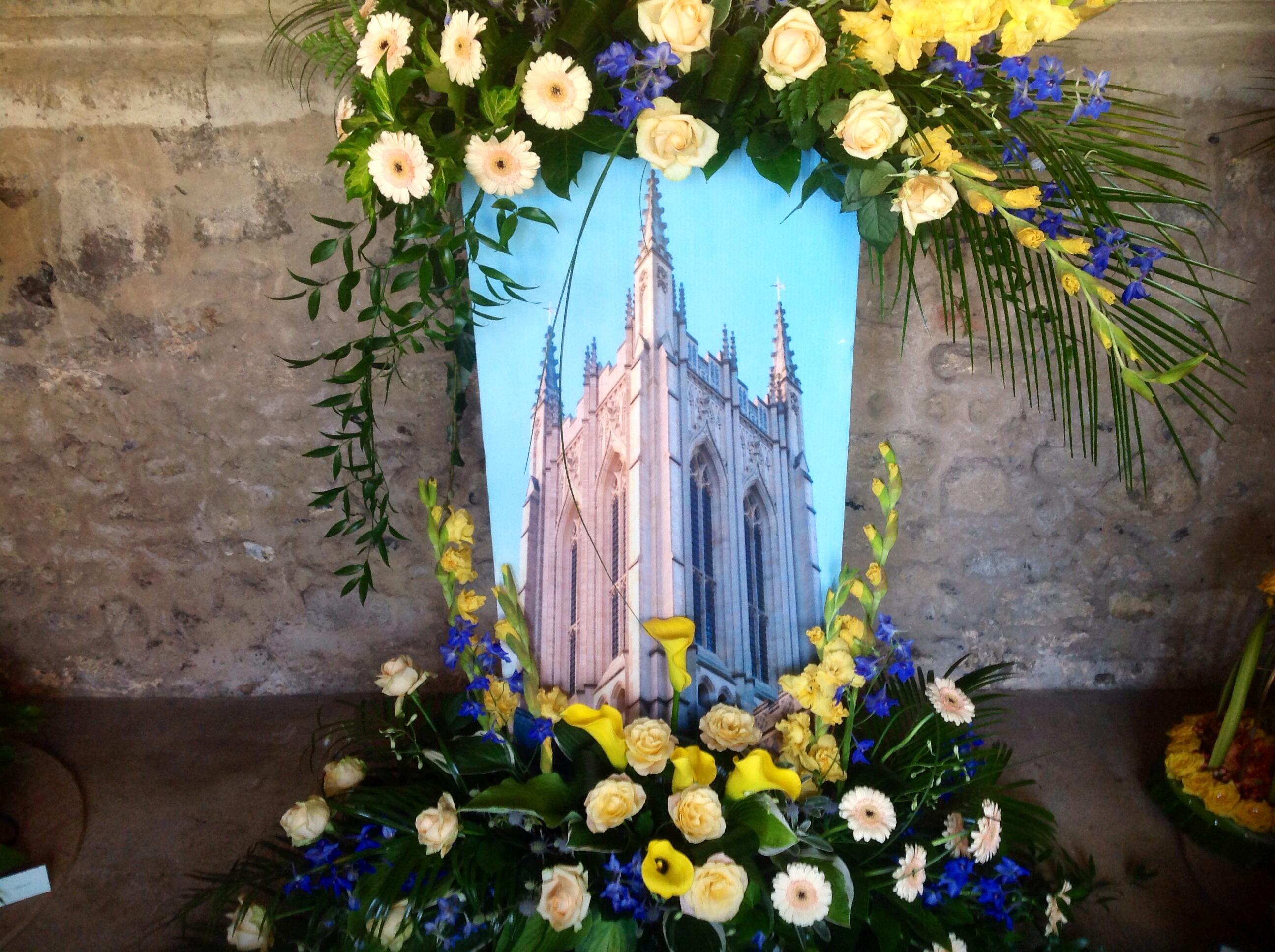 A large photograph of the cathedral framed with flowers.