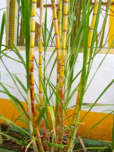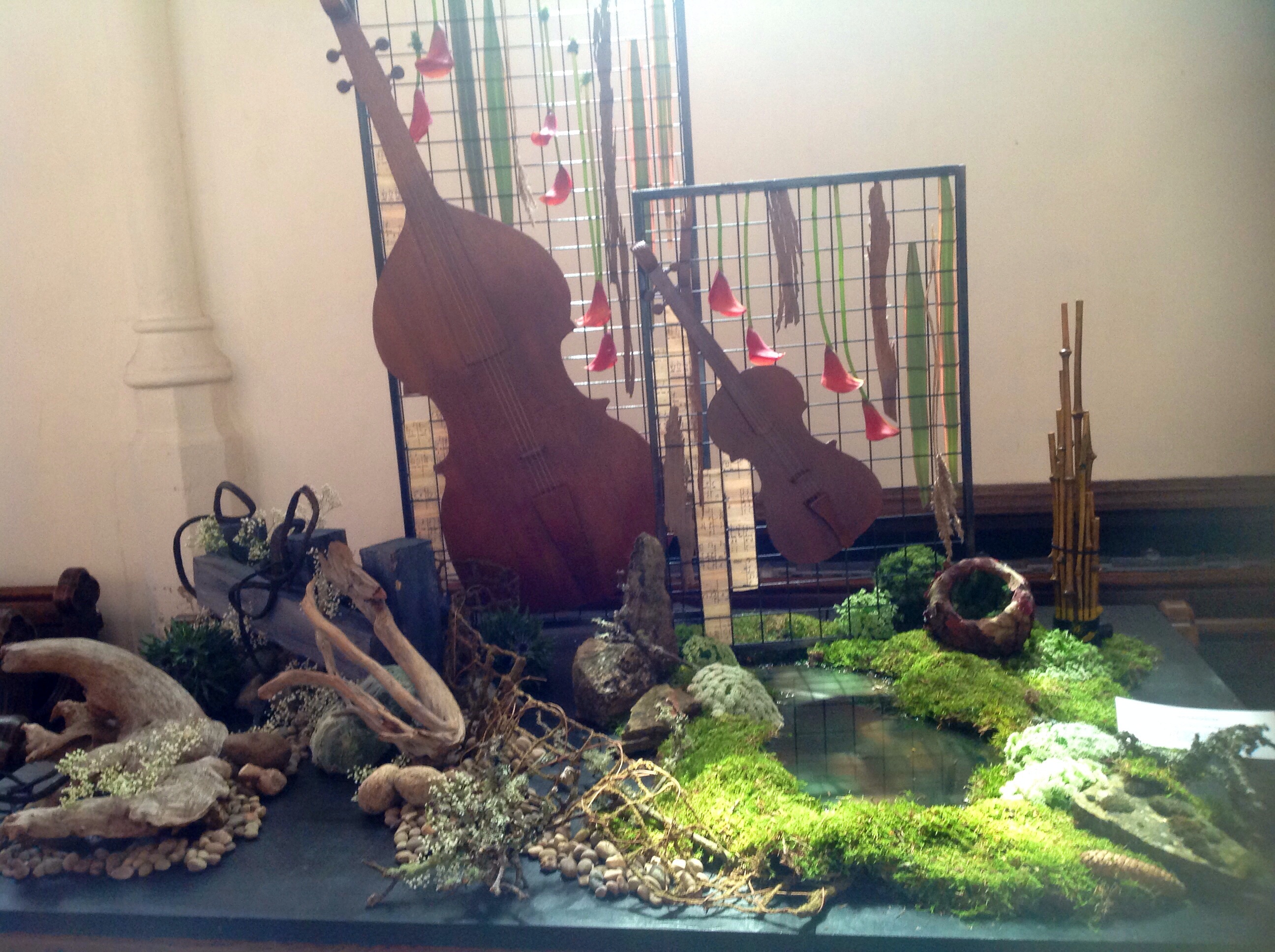 Floral musical instruments on display.