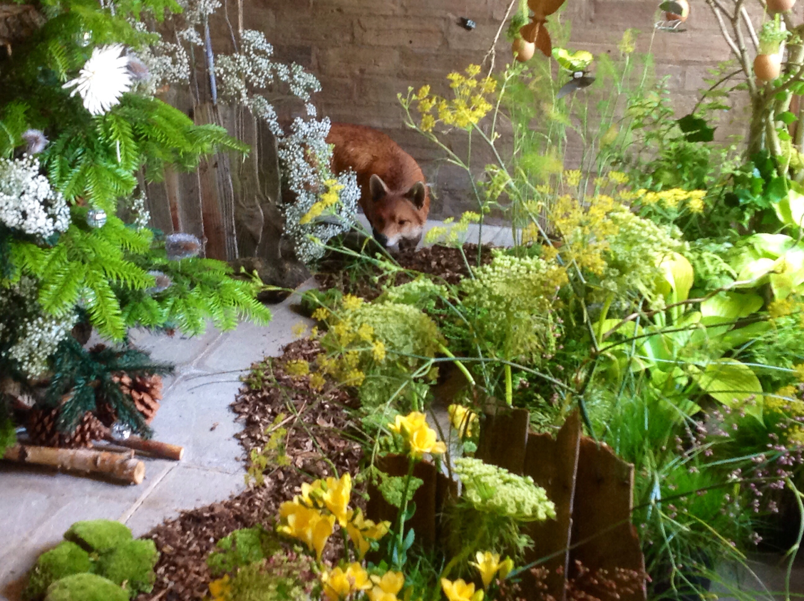 A beautiful countryside floral arrangement ~Sadly with a stuffed fox in the corner.