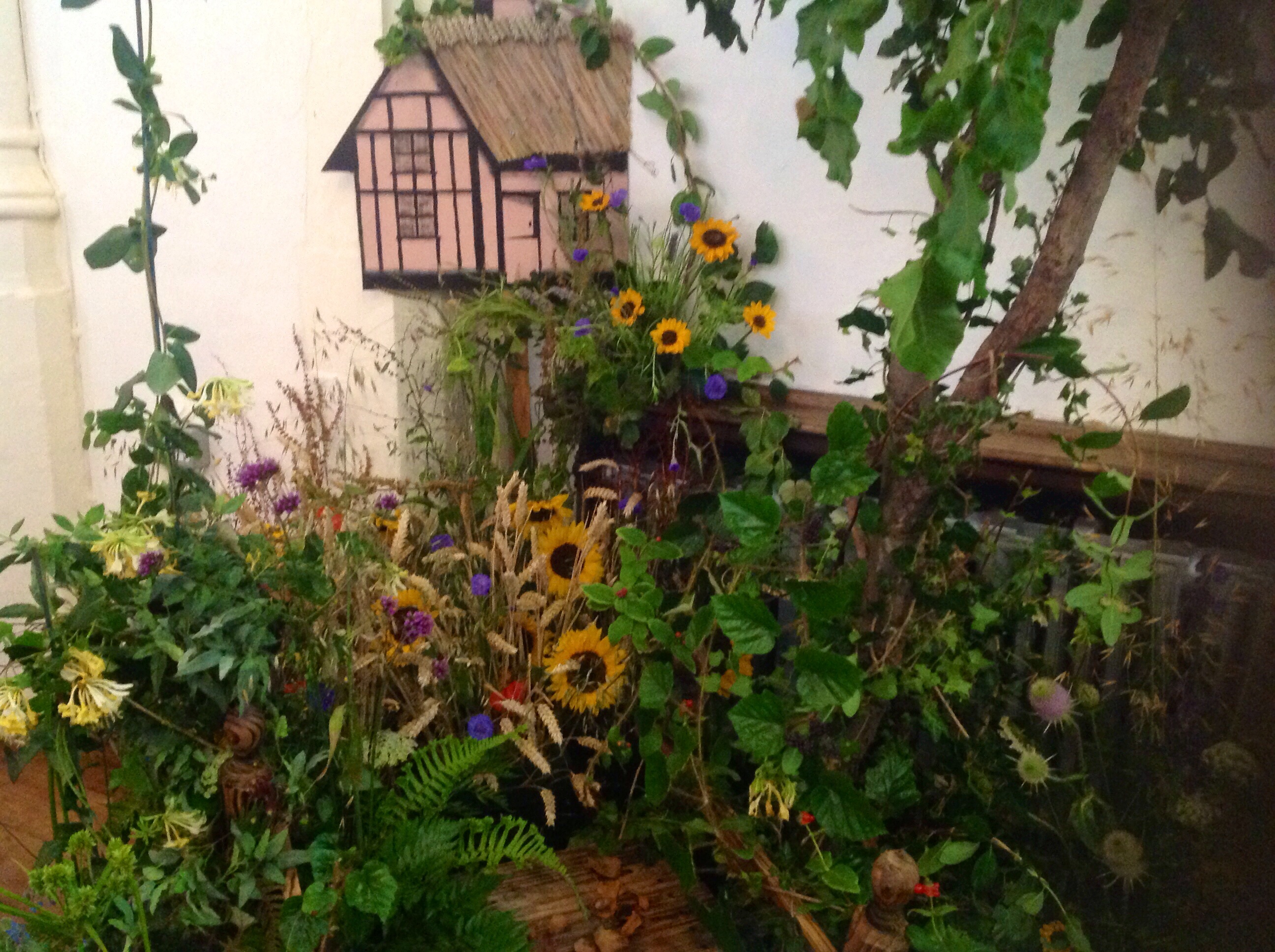 An interesting wooden house set in a lovely floral display.