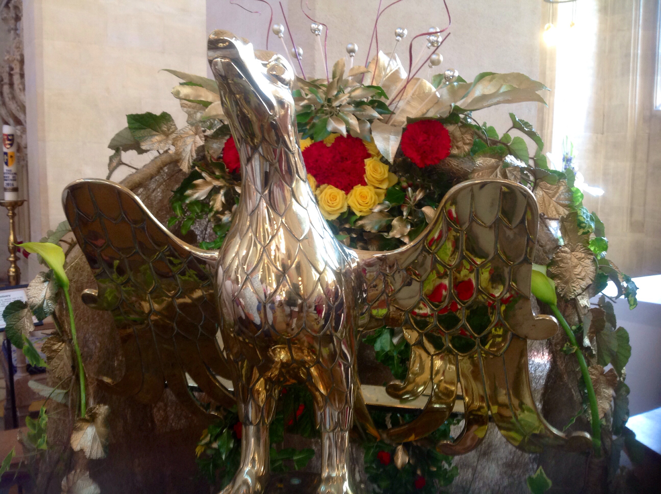 An impressive brass eagle head, lectern, highly polished and tastefully decorated with flowers