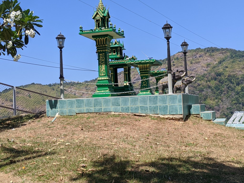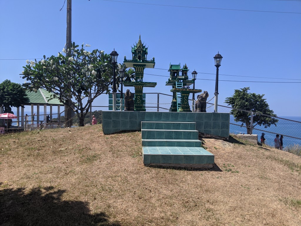This high hill overlooking the popular Ya Nui Beach on one side, and the bay of Nai Harn on the other, is called the Windmill Viewpoint, The Windmill is actually a huge wind turbine that is visible for miles around. Our first sight was an interesting green-coloured Buddhist shrine containing offerings of flowers, fronted by an impressive pair of Elephant statues. I have included a photograph of this at the bottom of this post. The view here was spectacular with a cloudless blue sky overlooking a darker blue sea. The green vegetation on the hillside, consisting mainly of palms and cacti, looked beautiful. We were high above Ya Nui Beach, looking down on the tiny figures of people on the beach below. The deep-blue sea was dotted with small boats. Passing sea traffic, ranging from long-tail boats to fishing boats heading out into the Andaman sea, This impressive viewpoint overlooks a tiny, green, tree-covered island, named ‘Koh Man’, which reminded me of a tiny green emerald set in a sapphire blue sea. These beautiful photographs brighten up our strangely compressed lockdown days. We can but relive the memories. Perhaps one day Margaret and I will safely return to our travels again. Stay safe and keep well. Love ❤️ and Peace ☮️ from John and Margaret