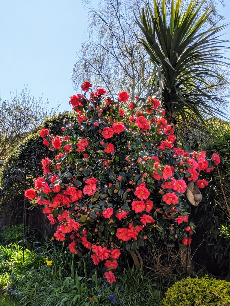 The first of the big flowers to burst into bloom in our relatively small garden is this extremely attractive Camelia. We have nurtured and taken care of this extraordinary shrub for the last fifteen years. Buds are visible all over the branches in December which suddenly burst into a sensational covering of quite large blooms. They gradually fade and drop from the branches, covering the lawn with the discarded flower heads, loose petals and tiny buds. I am often filled with wonder at the effort this shrub makes to produce such perfection.