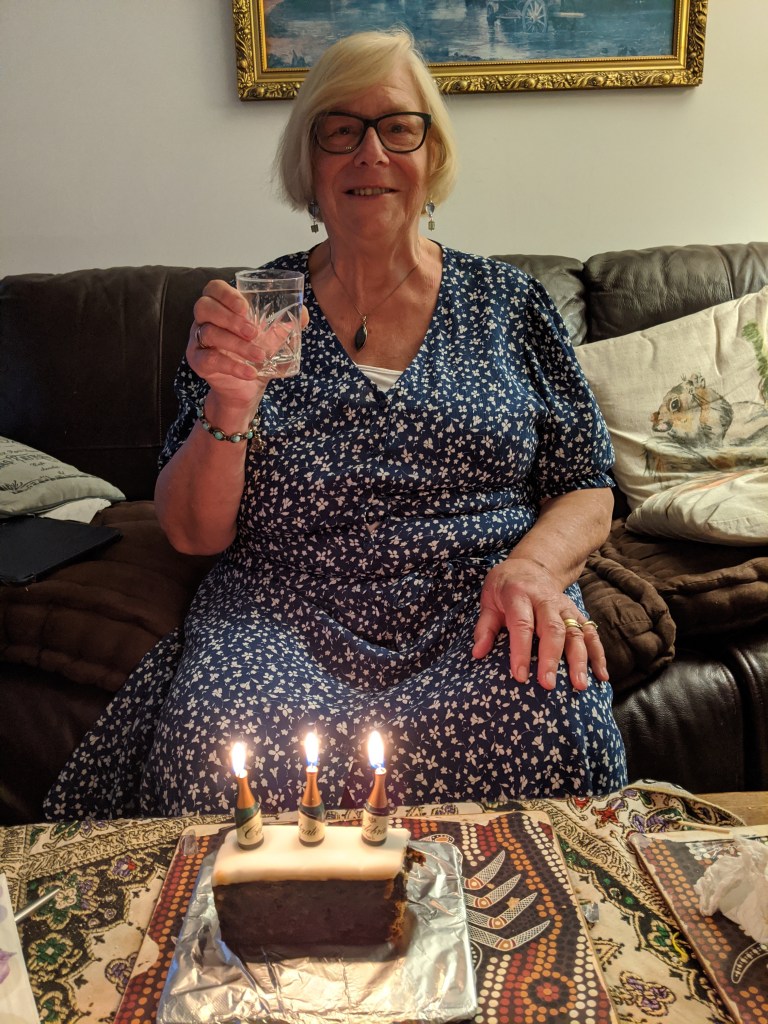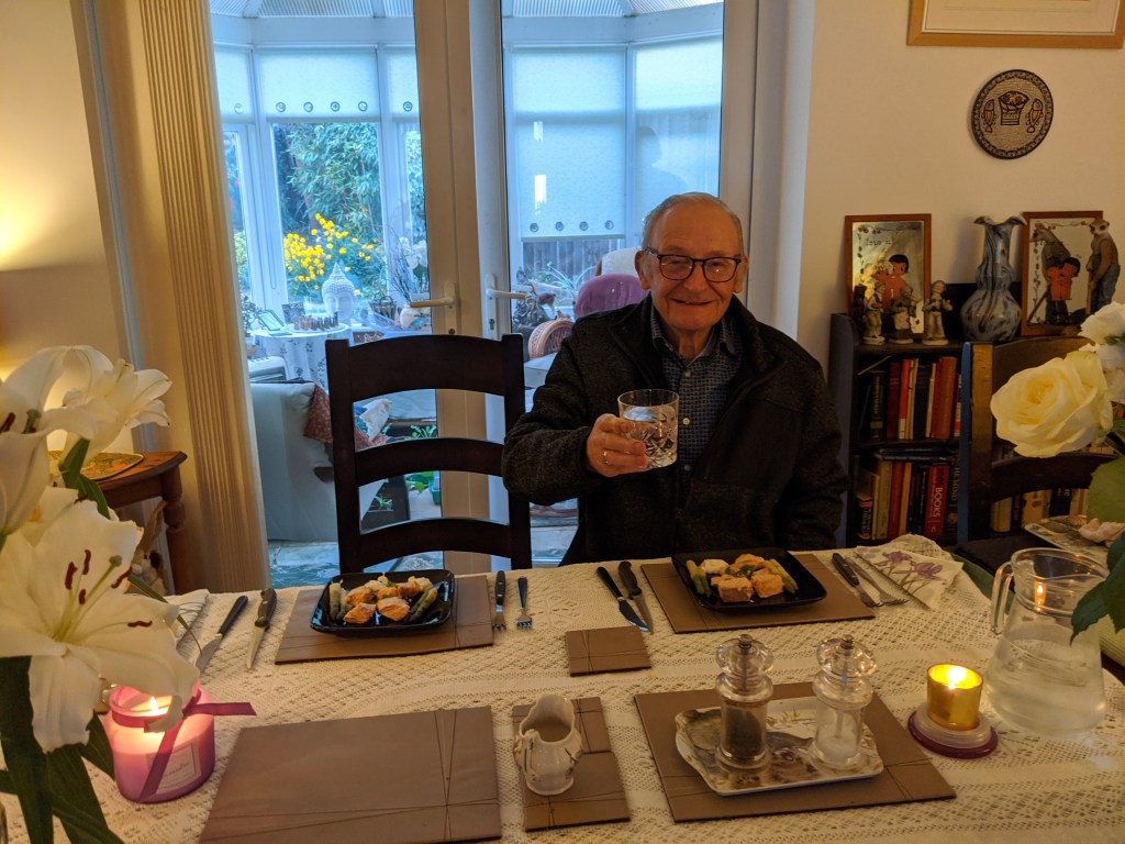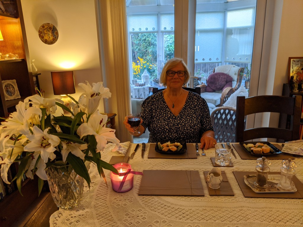 We decided to have a special birthday dinner at home. We were unable to find any local takeaway delivery service that operates on a Monday. Margaret prepared a delicious meal at home and we set the table with candles and flowers she had had presented to her by our daughter, Helen. There was also wine and chocolates dips and crisps from a food hamper provided by our daughter Liz. We sat and enjoyed the close of a special day for the birthday of a special lady.