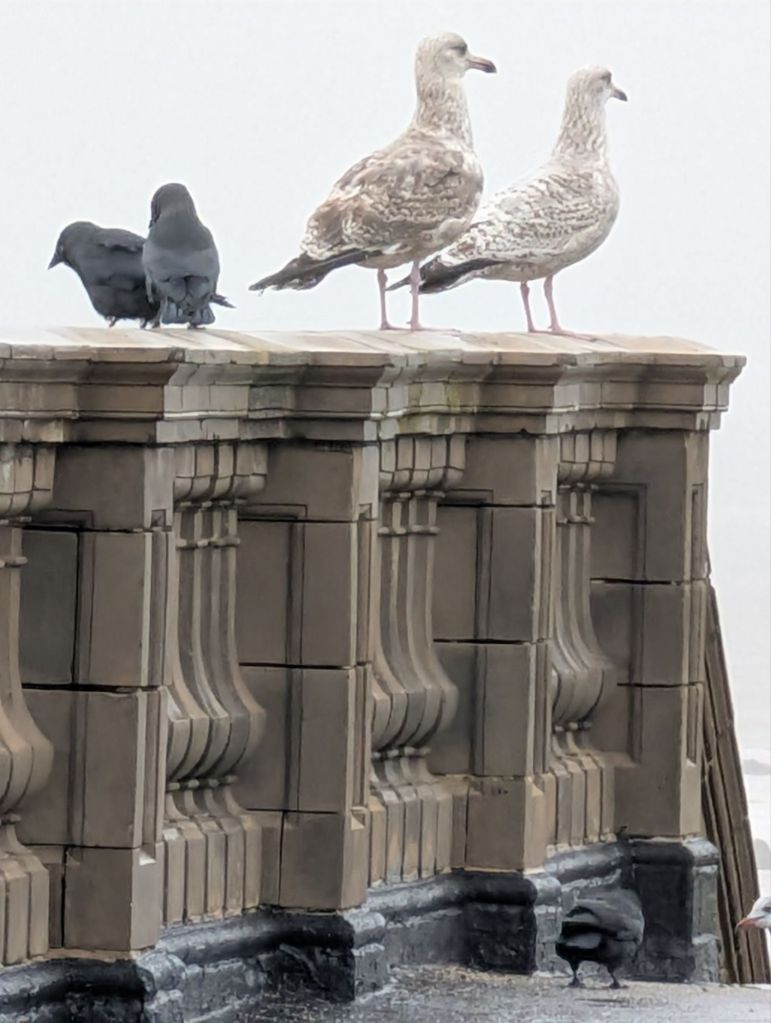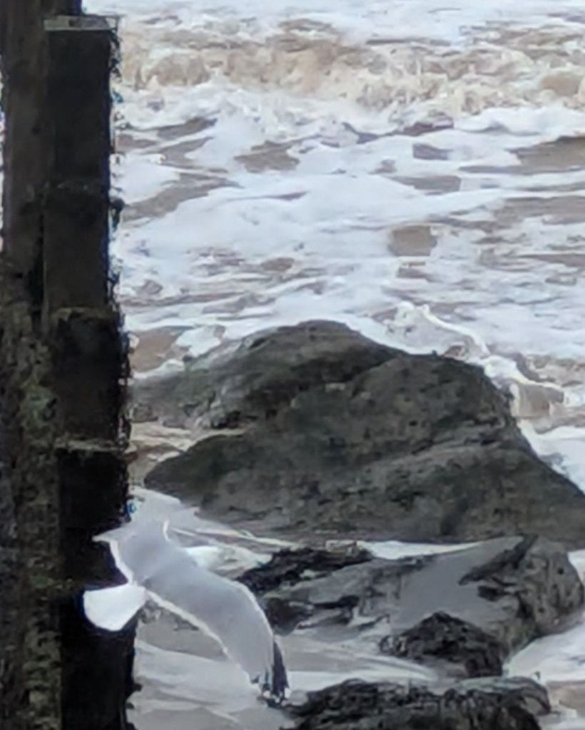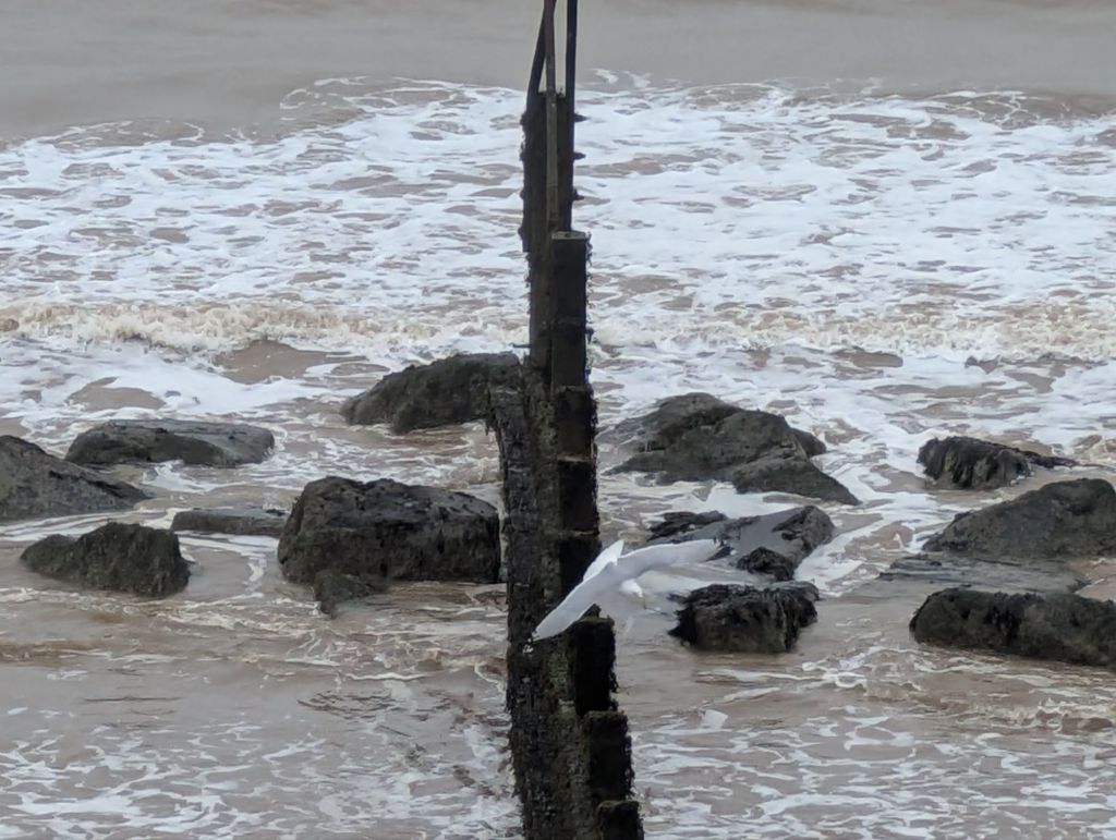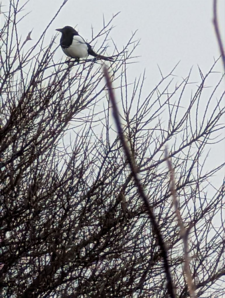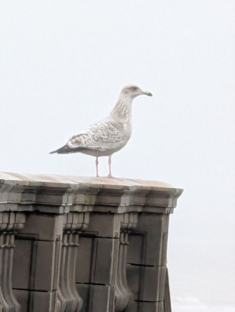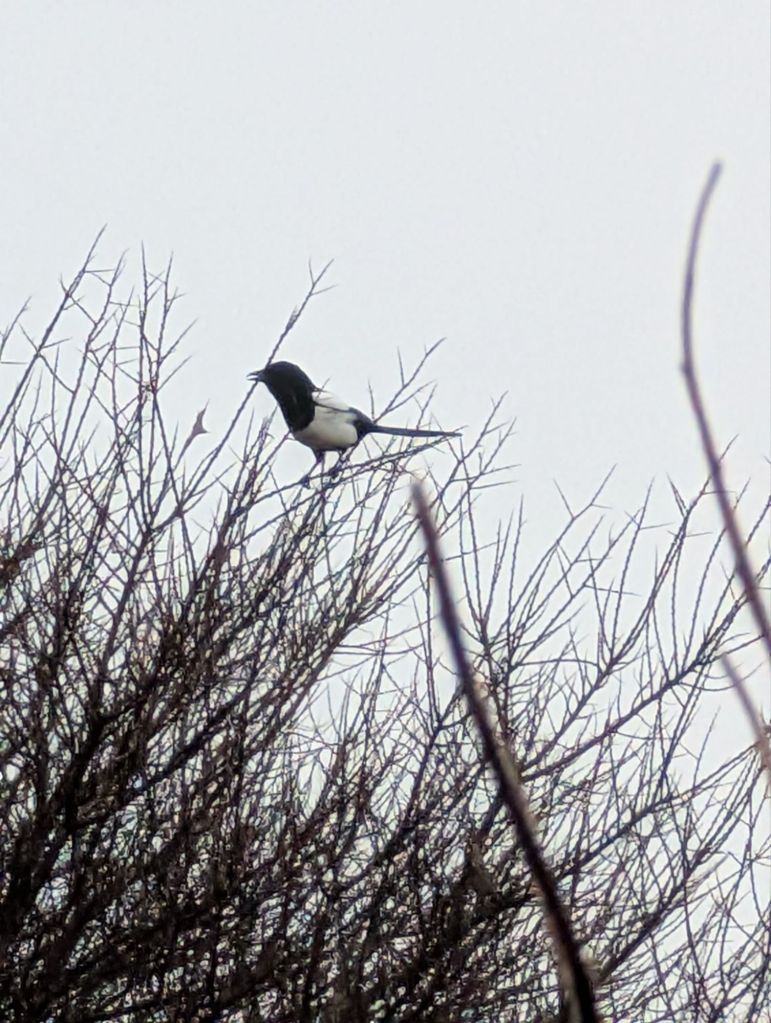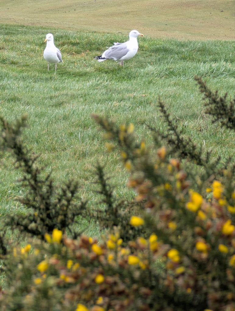 A Magpie was perched at the top of a tree, making typical magpie chattering calls. Nearby, a Herring Gull was lazily gliding above the golf course hill, taking advantage of the moderate southeasterly winds.
