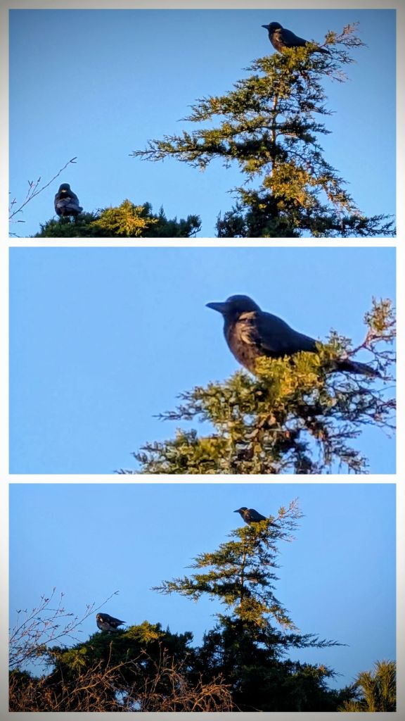 I turned into Foxglove Lane, two crows were perched high on the top of the pine trees growing along the grassy area adjacent to the playing field. I stopped, quickly pulled out my mobile phone, and photographed them.