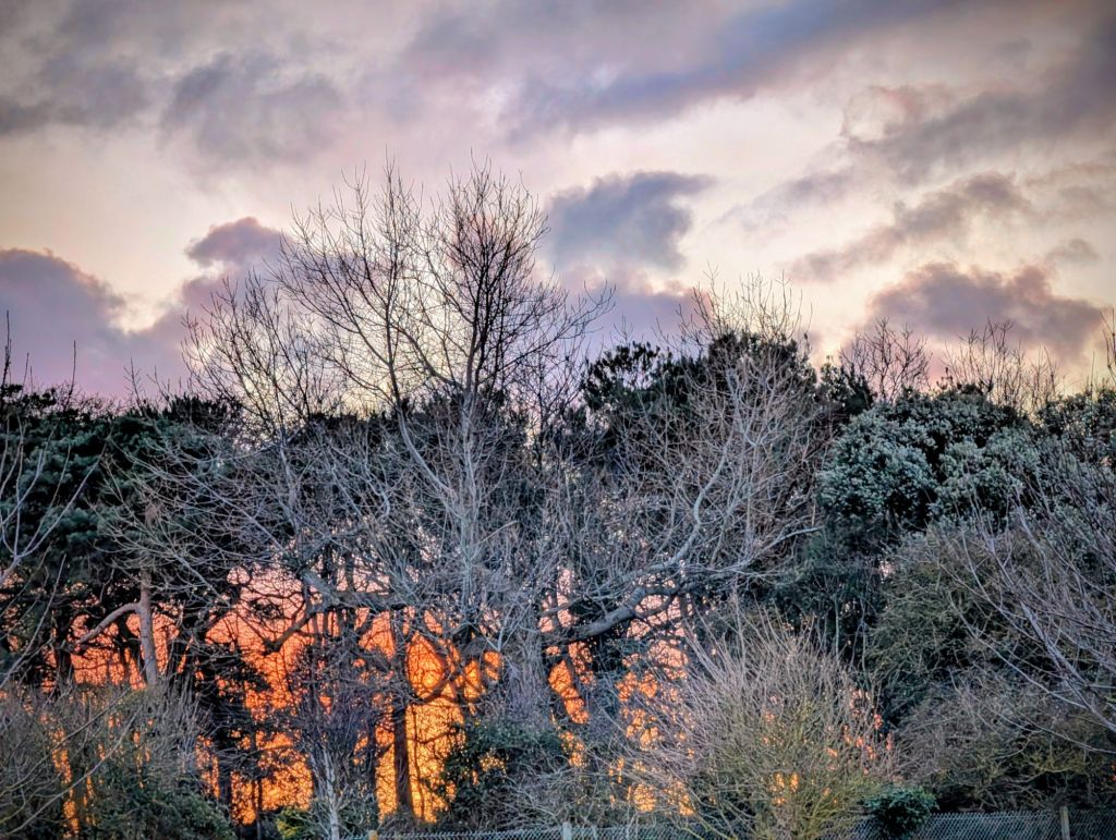 In the cemetery, I noticed another beautiful, fiery sunset through the rookery trees and stopped to take a few photographs. As I left and made my way along the cemetery road, I could hear the familiar, deep-throated bark of the Pitbull Terrier in his garden.