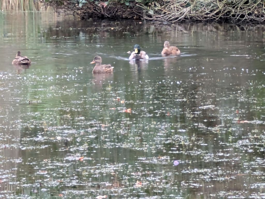 Several gulls were spread out over the recreation ground, feeding on the grass. The rainfall got a lot heavier and, because of the strong winds, I hadn’t brought an umbrella. I then headed for home to dry off in the warm.