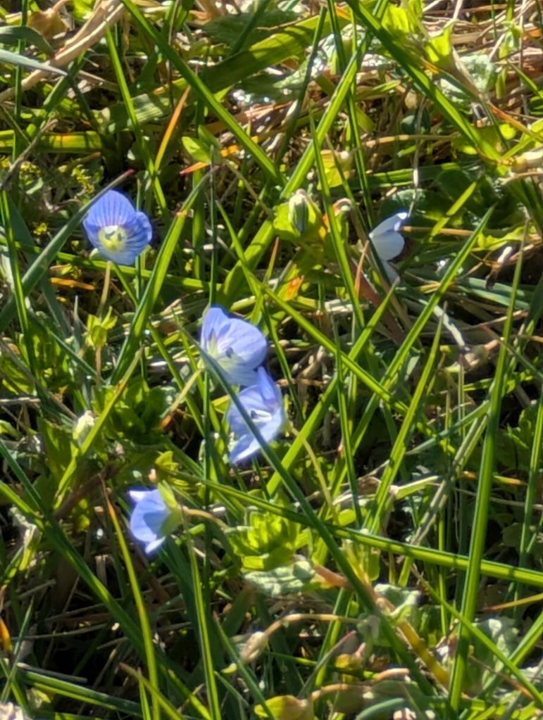 I noticed a flock of feral pigeons flying speedily over the abandoned factory rooftop they use as a colony. A pair of gulls were perched on the leisure centre rooftop as I passed. Finally, I photographed some tiny blue Speedwell flowers growing alongside a large patch of dead-nettles on a grassy bank next to the recreation ground.