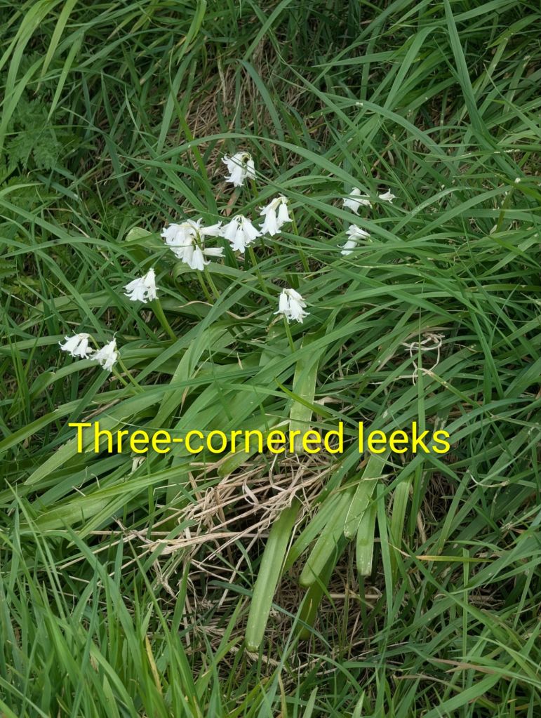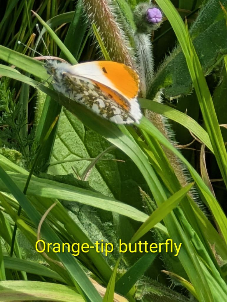 Then I spotted what was probably my best sighting of the day: an Orange-tip butterfly settled on some wild plants in front of me. Sadly, the wind was blowing quite strongly, and I only managed to take a partial photograph. I also took a couple of nice photographs of wildflowers growing alongside the path as I continued on my way. Pink sorrel and a clump of three-cornered leeks were pushing through the long grass, in spite of the competition.