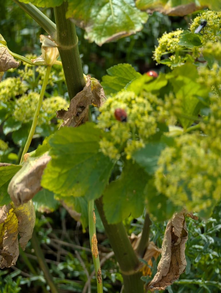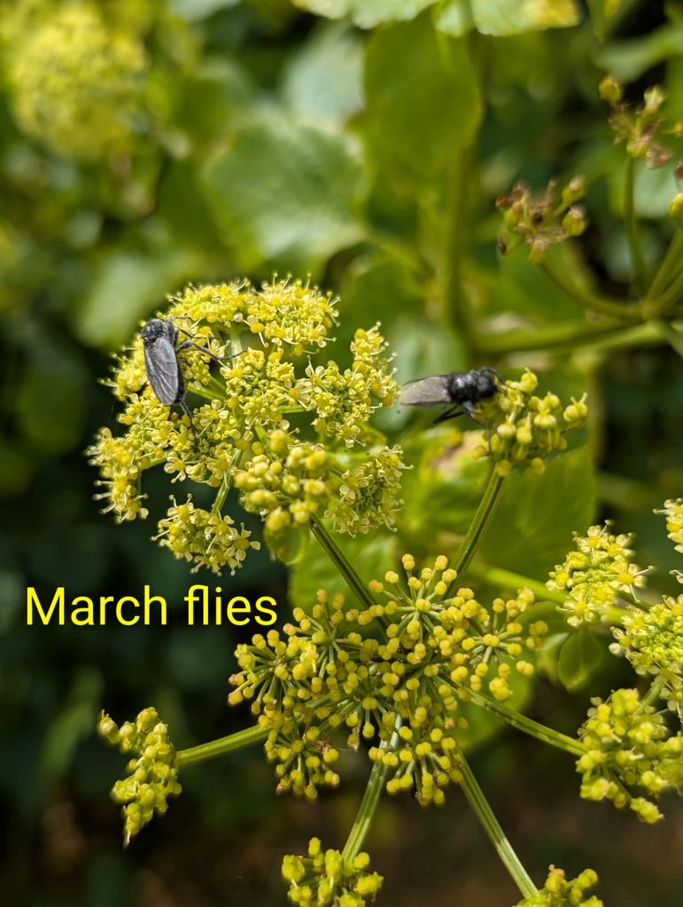 I then began to walk along the top of the clifftop path up to the coastwatch station. Along the way, I had to run the gauntlet of about a million black March flies that were feeding on the nectar produced by the Alexanders plants, along with a large number of ladybirds. I have never seen so many flies flying around at the same time! I took a couple of photographs with difficulty, and Google Lens later identified them as March flies.