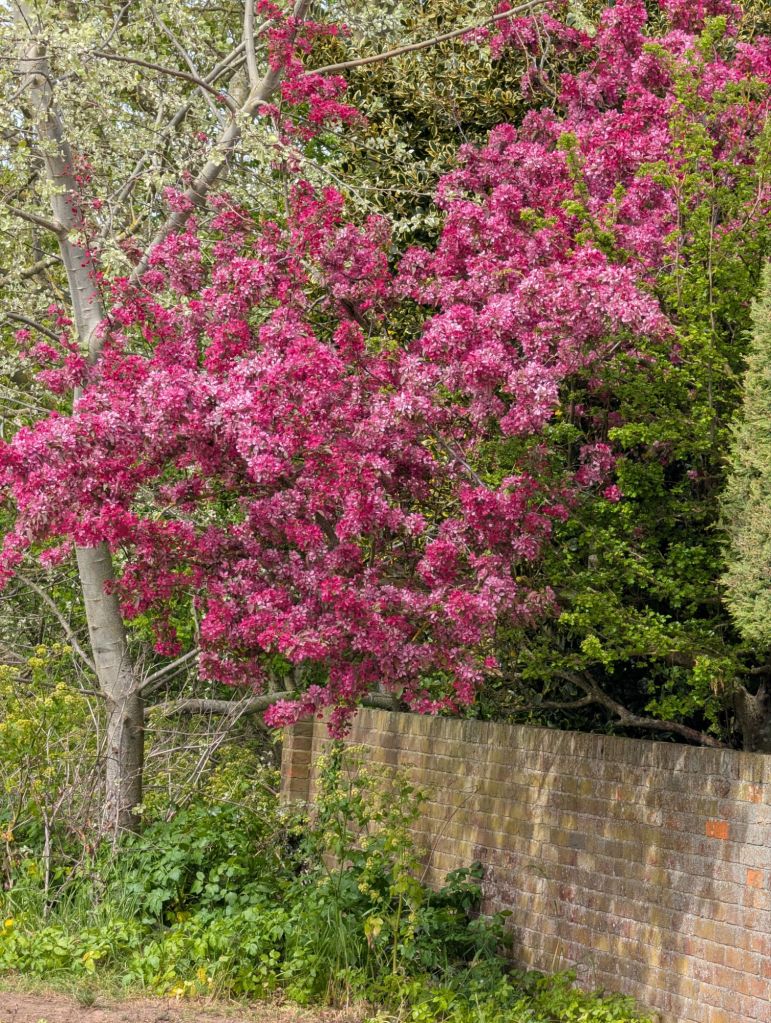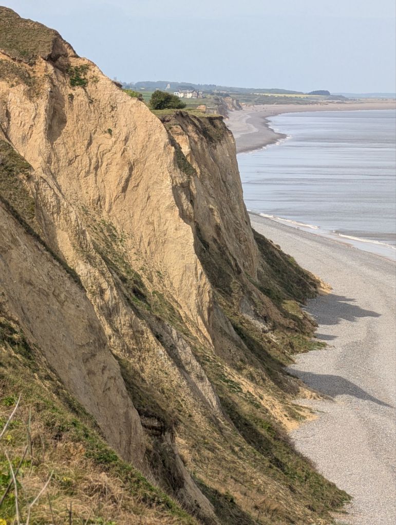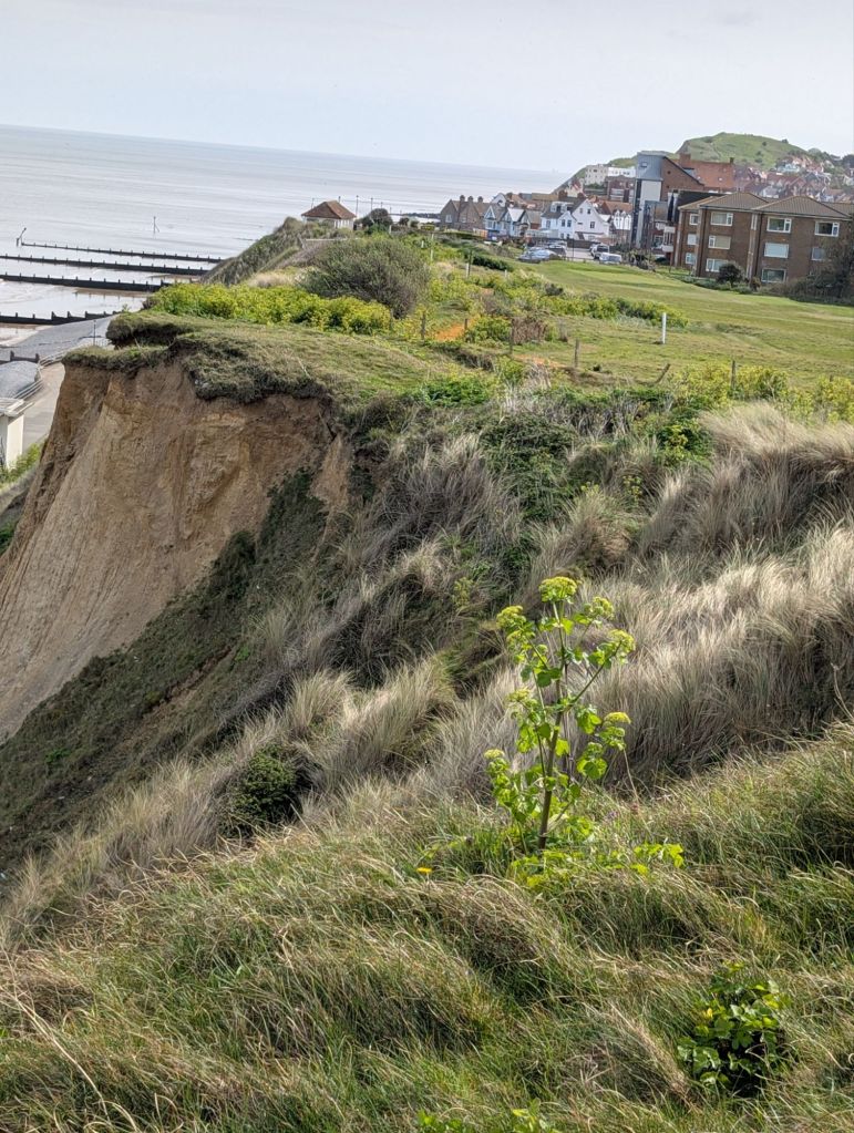 I took some nice photographs of the precipice-like cliffs on the way to the top and some wonderful shots of the view from the coastwatch station. On my way back to the golf club, I took an interesting photograph of a bank of green alkanet. I passed a man walking an impressive, large white poodle with an undocked tail, showing off a well-trimmed coat. I also took a photograph of some purple honesty flowers growing underneath the bushy branches of some damson trees alongside a private garden.