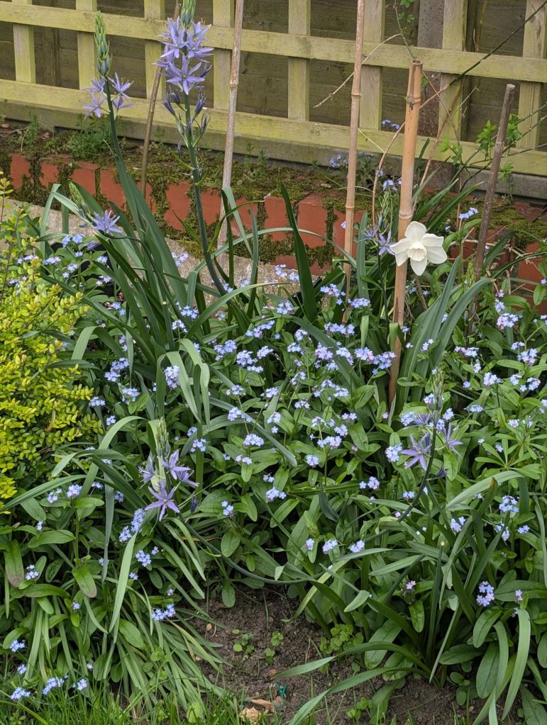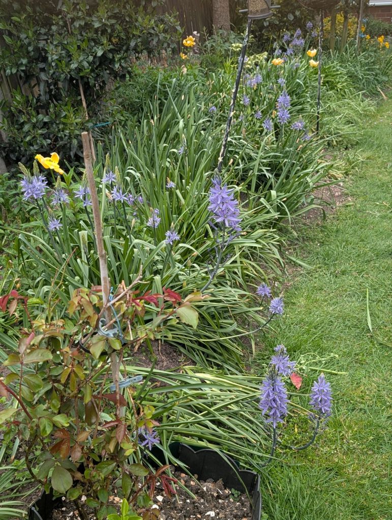 Joining them are the Camassia—striking blue spikes often known by the affectionate, historic name ‘Indian Lilies.’ Meanwhile, bluebells have claimed the shady corners, spreading into lush clusters beneath the showy garden shrubs. To complete the scene, we introduced fresh Petunias and Verbenas, from  the local garden centre.