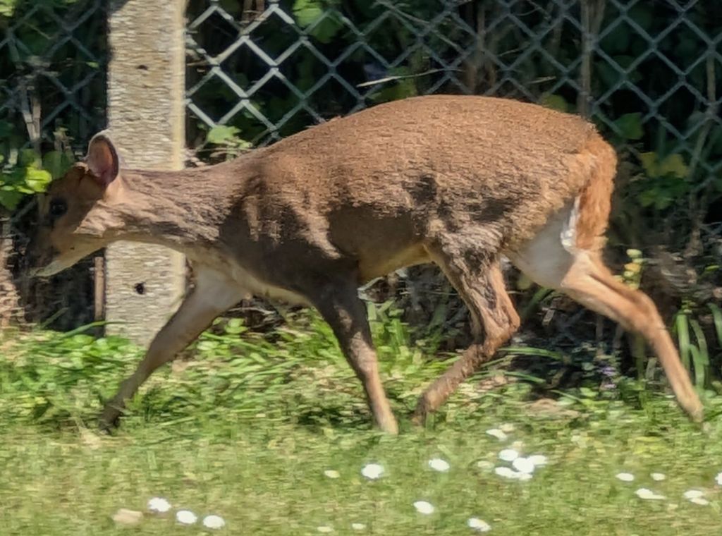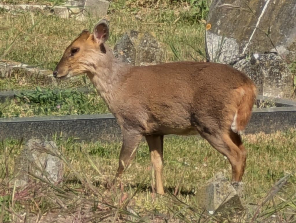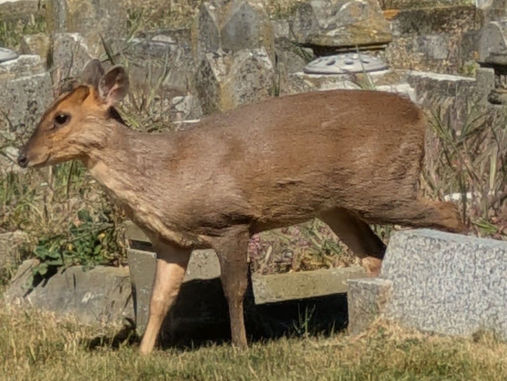 A male blackbird provided the soundtrack near the play area, while the local rooks and a solitary magpie claimed the recreation ground. Even the neighbourhood’s “friendly” Pitbull was taking it easy, dozing in a sun-drenched corner. In the cemetery, the cherry blossoms were putting on their final show, carpeting the ground in a cycle of growth and decay. The highlight, however, was a muntjac deer grazing 100 yards off. I managed a few shots before it vanished behind a shed, only for it to reappear and trot toward the far fence as I headed for the gates—a charming sight, even if their taste for memorial flowers makes them a bit of a local nuisance. After a quick snap of some pink sorrel in the hedgerow, I passed the leisure centre where five feral pigeons were holding their regular rooftop meeting.