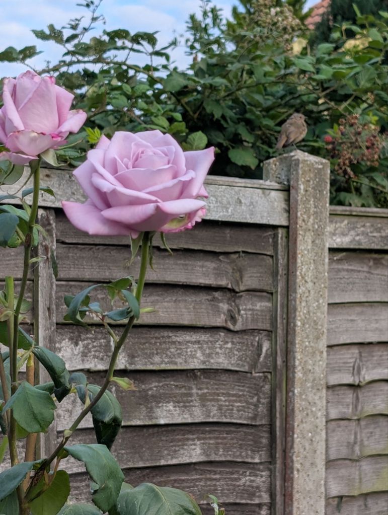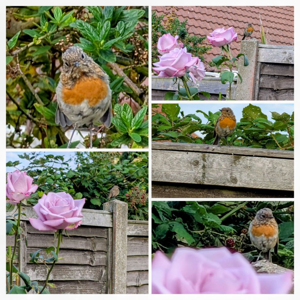 Meanwhile, a robin arrived and perched on the adjoining fence; he was almost immediately joined by a juvenile robin who kept a safe distance.