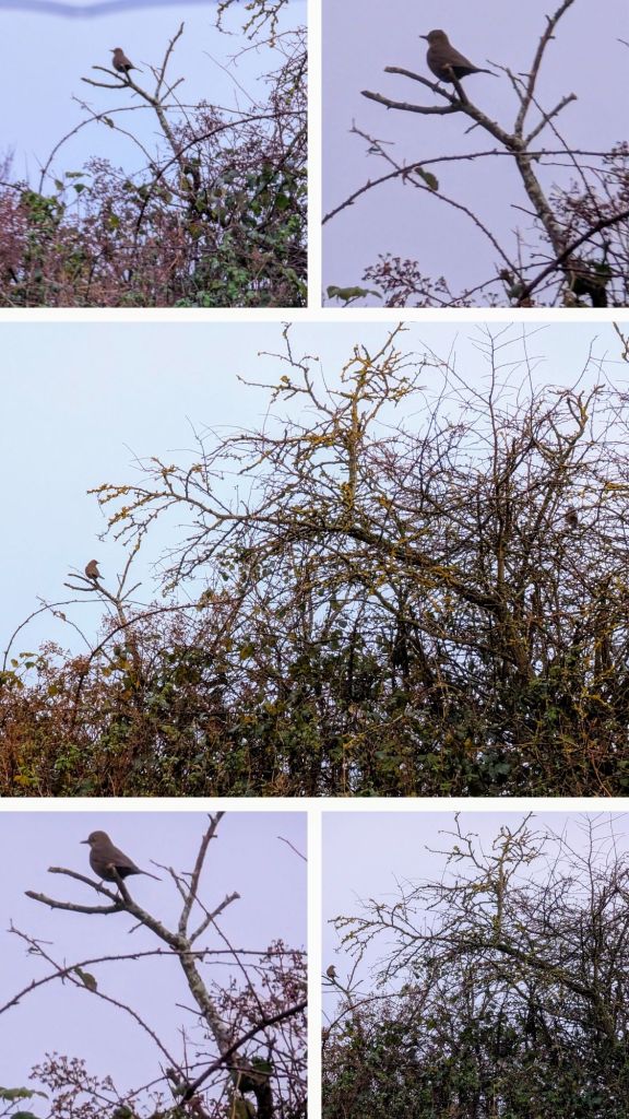 I noticed two small flocks of about six blackbird-sized birds feeding on the grass amongst the larger birds. I took a couple of photographs of them, and Google Lens later identified them as mistle thrushes.