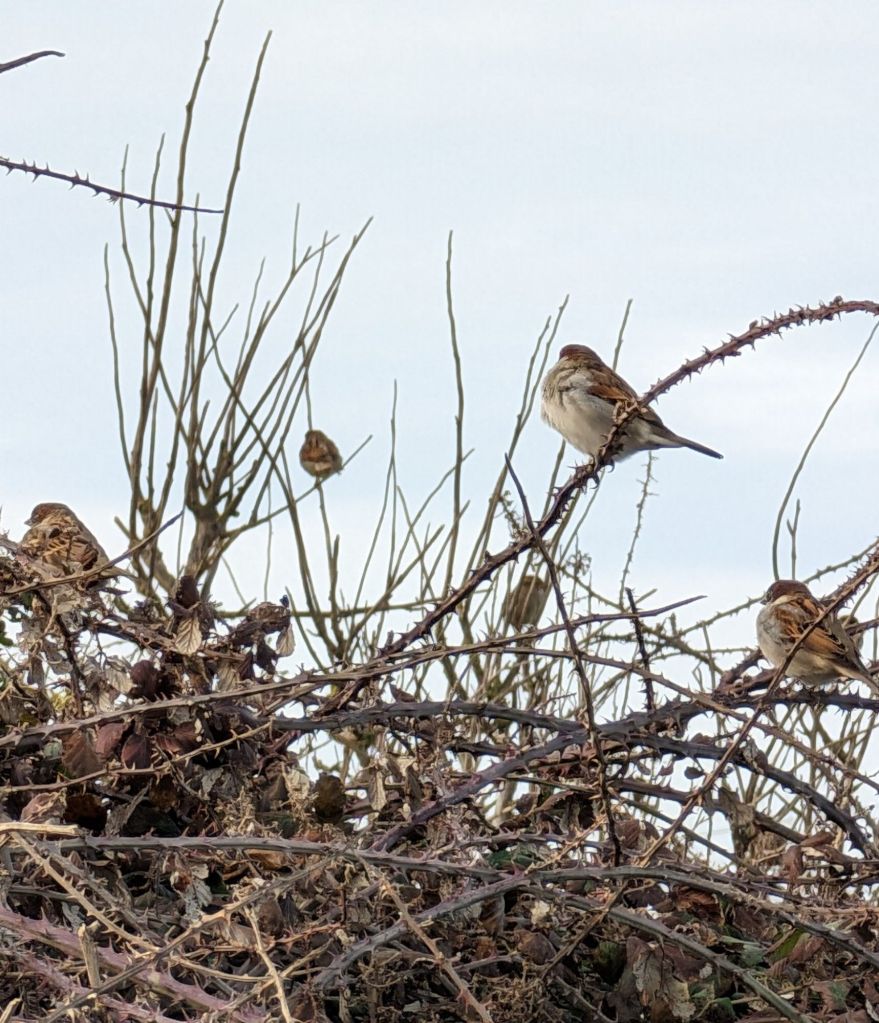 I walked along past the leisure centre, where 10 house sparrows were perched and hopping around on the branches of a hawthorn hedge adjoining the next-door care home.