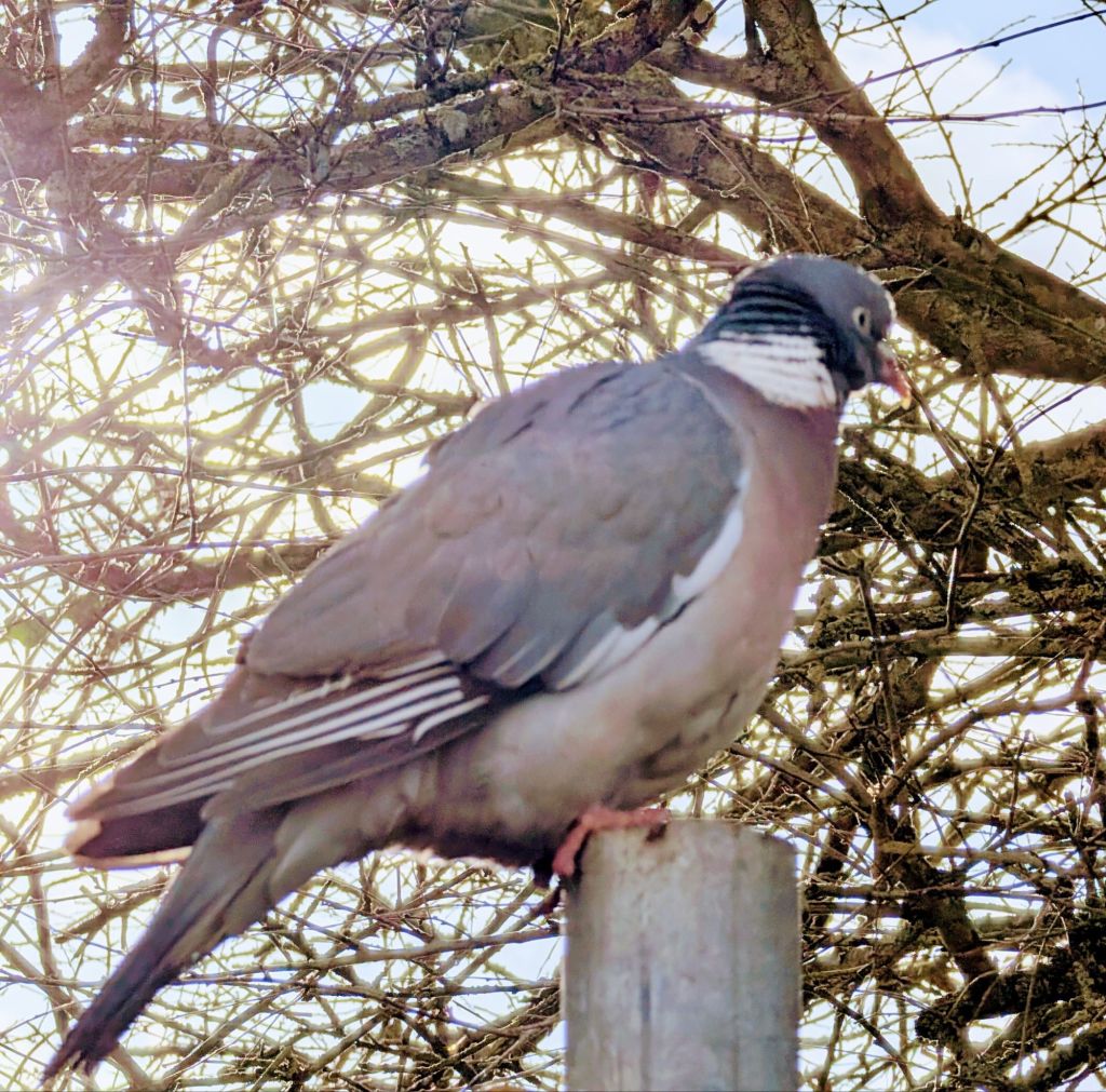 I walked outside into dazzling bright sunshine with a mild breeze today. Three jackdaws were perched on a rooftop when I turned into a local lane and I noticed a wood pigeon on a nearby house. I walked around the outskirts of the recreation ground. A few rooks from the rookery were around, making a lot of noise as they called to one another, and a wood pigeon was flying over the cemetery.