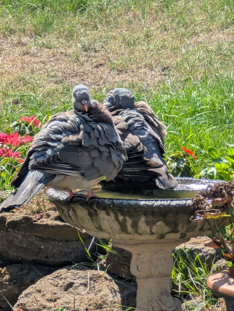 Our resident Wood Pigeon was enjoying a splash in the birdbath. A Robin was perched on the dividing fence between our garden and our next door neighbour’s garden. Later, the pair of Collared Doves returned and were hopping around under the feeders. Three Goldfinches were feeding until one took a drink from the birdbath and they flew away.