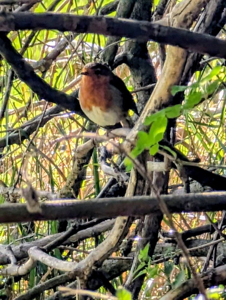 Some beautiful, strong gold sunshine was swiftly melting a slight early morning frost. A flock of about 30 feral pigeons was flying around the rooftops of the industrial estate across the busy main road. Several corvids were feeding on the golf course grass, many of them jackdaws mingled with a few rooks. A lady passed by, walking a lively Pekinese-type dog, and I also passed a young woman with a brown poodle-type dog around the outskirts of the golf course. A single gull flew down onto the boating lake as I reached the clifftop viewpoint. I shot a short, dramatic video of the waves crashing into the seashore. The sound of the seawater dragging some small pebbles around on the beach was surreal. I also took a couple of still photographs of the white-topped waves rolling into the shore. A man walking a Golden Retriever walked along the clifftop path. I couldn’t resist taking a couple of photographs of some frost-covered tree mallow shrubs. In fact, the whole row of these shrubs alongside the clifftop pathway drooped and looked sorry for themselves. A lady walking a Jack Russell terrier wandered along the promenade with many other people, enjoying the cool, pleasant morning sunshine. Several hedge sparrows were flying around the hebe shrubs growing on the promenade gardens. Two men with two retrievers were laughing and watching their dogs barking loudly at each other. I’m sure dogs often symbolise and take on many of their owners’ characteristics. A lady with a well-behaved retriever-type dog ordered her dog to sit and wait while the barking was happening. A robin was perched on a twig at the edge of a shrub; the sunlight was shining on him, lighting up his vivid red breast. The people living in the bird-friendly house near the golf club entrance had just provided some food for the birds. About 10 gulls suddenly flew around, calling loudly to one another. A large flock of feral pigeons began circling around, and I noticed several jackdaws perched along the ridge of the rooftop. There were several corvids in the treetops growing along both sides of the main road towards the leisure centre, where I met up with Margaret. Today I walked for 2.25 miles in 46 minutes. Google Fit awarded me 28 heart points.