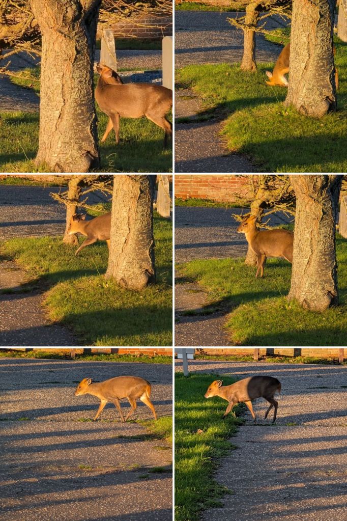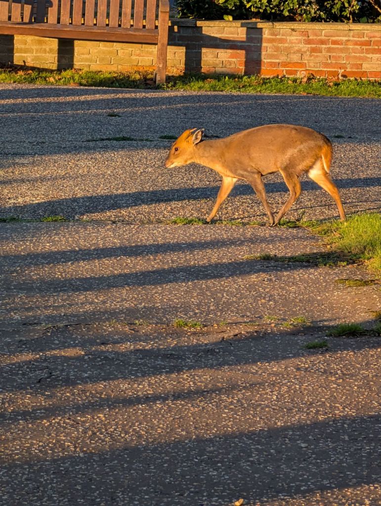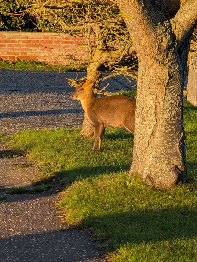 I was walking along one of the quieter roads in the locality on my daily walk today when I saw six magpies in the branches of a medium sized leafless Oak tree. I quickly raised my mobile phone to take a picture. Suddenly there was a movement of another creature right in front of me, I saw a brown four-legged creature walking slowly from behind a nearby tree. My first thought was what breed of dog is that? I realised it was a muntjac deer and promptly snapped a few photographs. The deer hopped over a low wall and raced off along the hedgerow into a nearby field. I never did get my photo of the magpies.