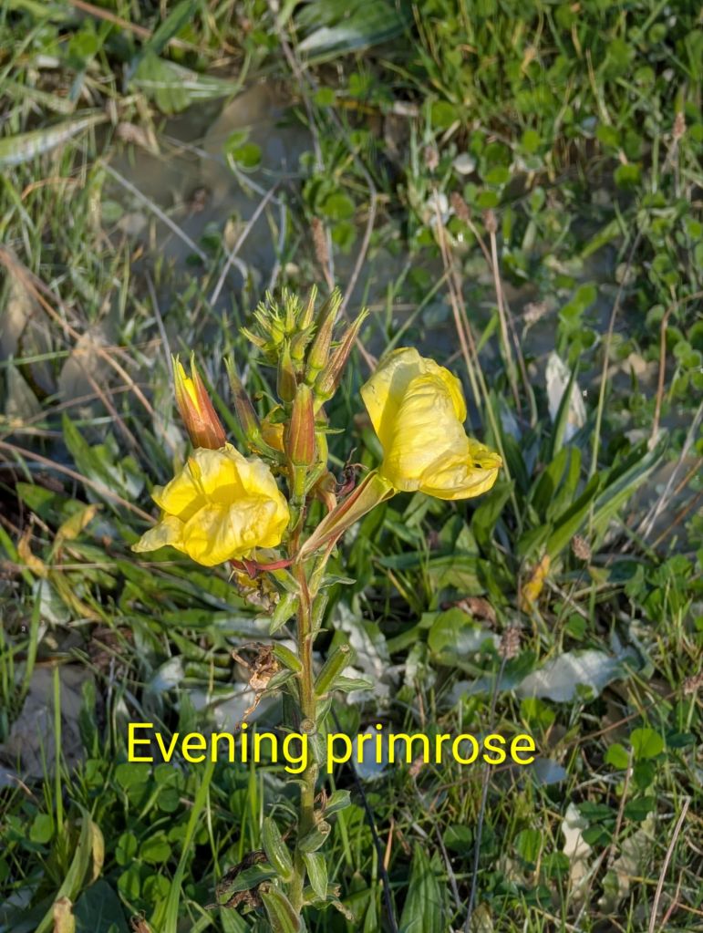 When I arrived at the town football ground, I noticed that on the border of the car park, a wild evening primrose plant had burst out with a couple of late, impressive yellow blooms.
