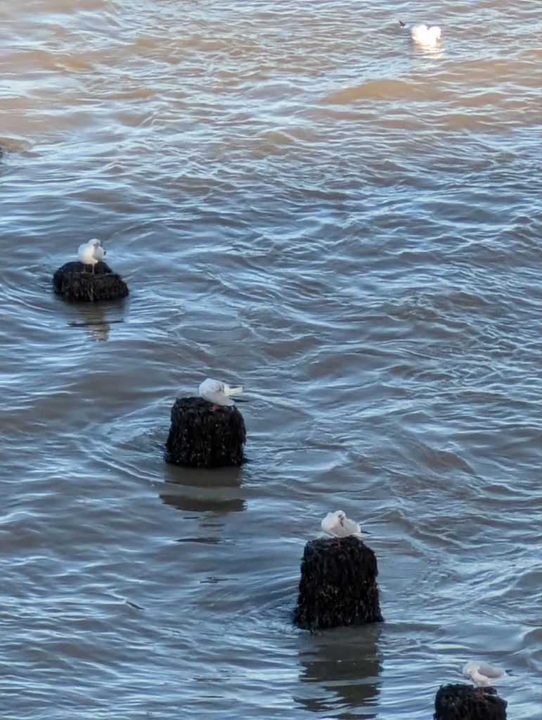 I began to walk along the clifftop path when, to my surprise and delight, a single medium-sized bird flew overhead. I was unsure what kind of bird it was until it suddenly started hovering over a patch of brambles. I quickly snapped a couple of photographs and a short video. Google Lens later identified it as either a peregrine falcon or a sparrowhawk. Sadly, I’m sure it was probably the latter, as I have seen a lot of sparrows or dunnocks flying around these brambles. I continued walking along the pathway and I noticed several gulls flying overhead and above the beach. I photographed a line of gulls perched on a line of posts, obviously part of a breakwater, showing above the waves.