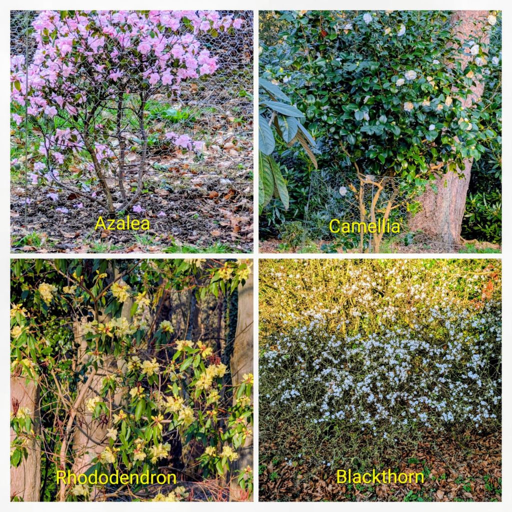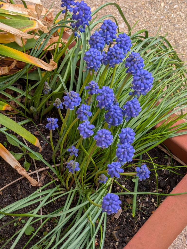 A powerful, gusty wind was blowing when I left the house to begin my daily walk. I decided to walk in the opposite direction today and was amazed at how many blue Grape Hyacinth plants were in flower everywhere. They were growing in many private front gardens and along the grassy banks and borders; it’s obvious that these lovely floral delights spread like wildfire wherever they begin to grow. I also noticed a profusion of different varieties of blue Greater Periwinkle plants in flower under the hedges and on the borders.