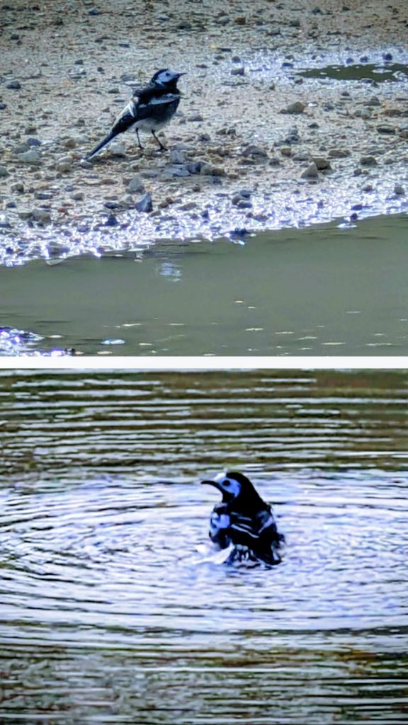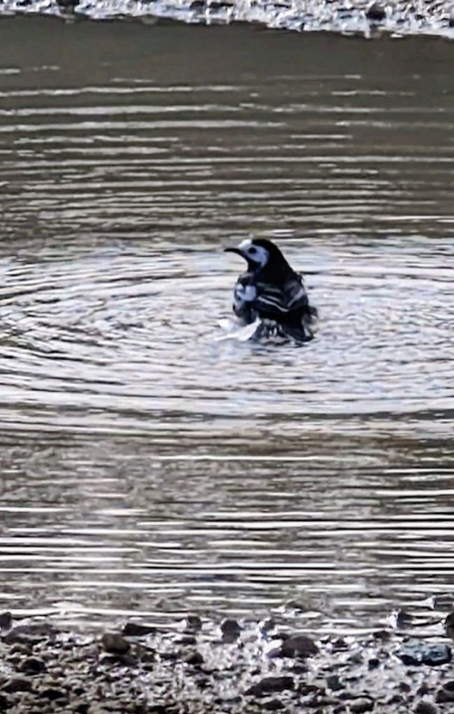 I snapped a nice photo and a short video of a pied wagtail bathing in a large puddle of rainwater near the cricket pavilion.