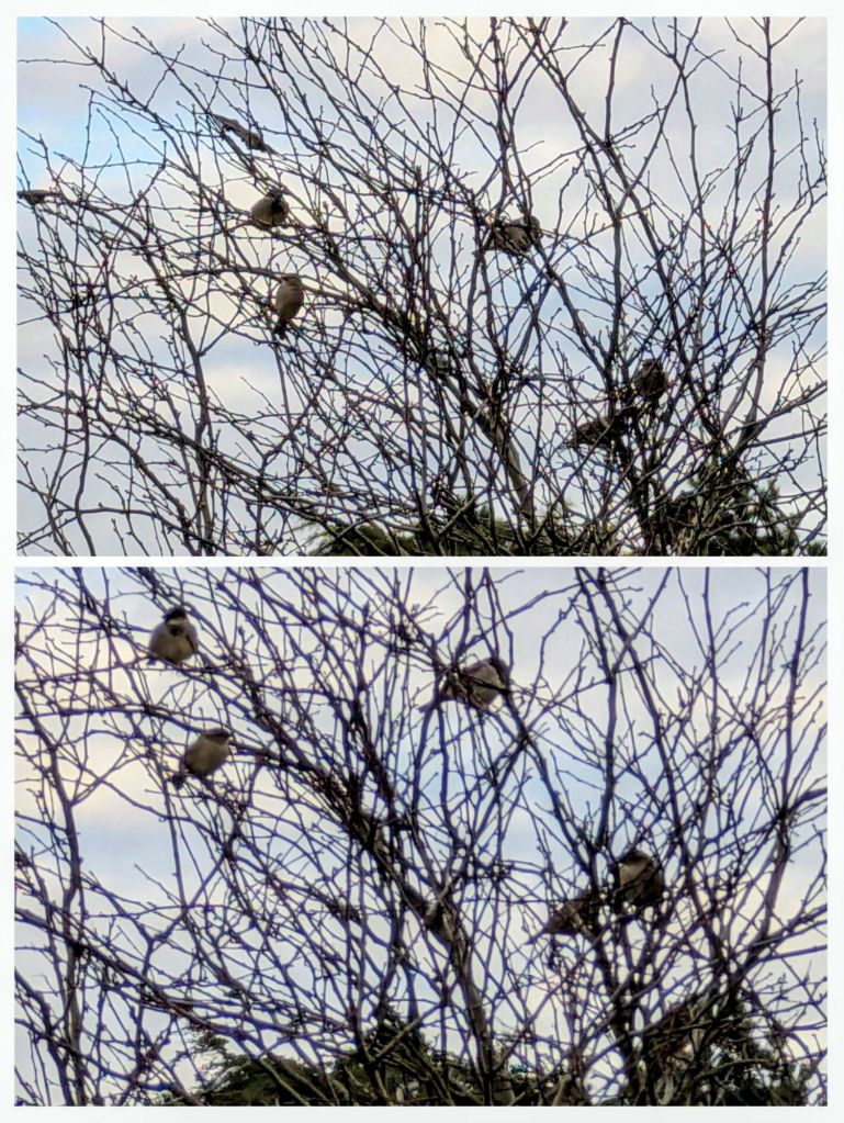 At the leisure centre, I managed to snap a couple of good photographs of a small group of sparrows perched on the hawthorn hedge adjoining the care home.