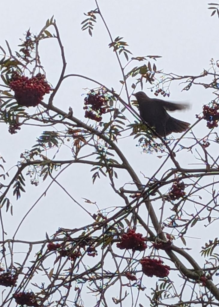Near the cricket field, a blackbird showed visible annoyance before retreating to a nearby shrub, while a group of twelve rooks foraged on the grass.