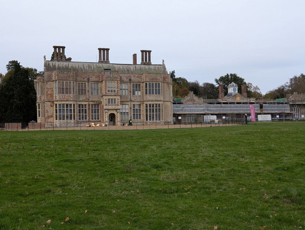 Stepping out of the car park, Margaret and I immediately joined the stream of pedestrian traffic along the busy road fronting Felbrigg Hall. The air was cool and crisp, filled with the constant drone of passing cars and a chaotic soundtrack of excited yips, jangling lead tags, and happy, snuffling pants. It seemed as though every family had brought their companion, creating a lively, shifting mosaic of hundreds of different types and breeds. We saw everything from tiny terriers straining at the leash to massive, lumbering hounds, all sniffing the grass verges with intense dedication. We followed the main road for a long distance before turning onto a pathway that led us past the main entrance of the hall and back towards the ‘Butler’s Pantry’—the National Trust café, evocatively named.