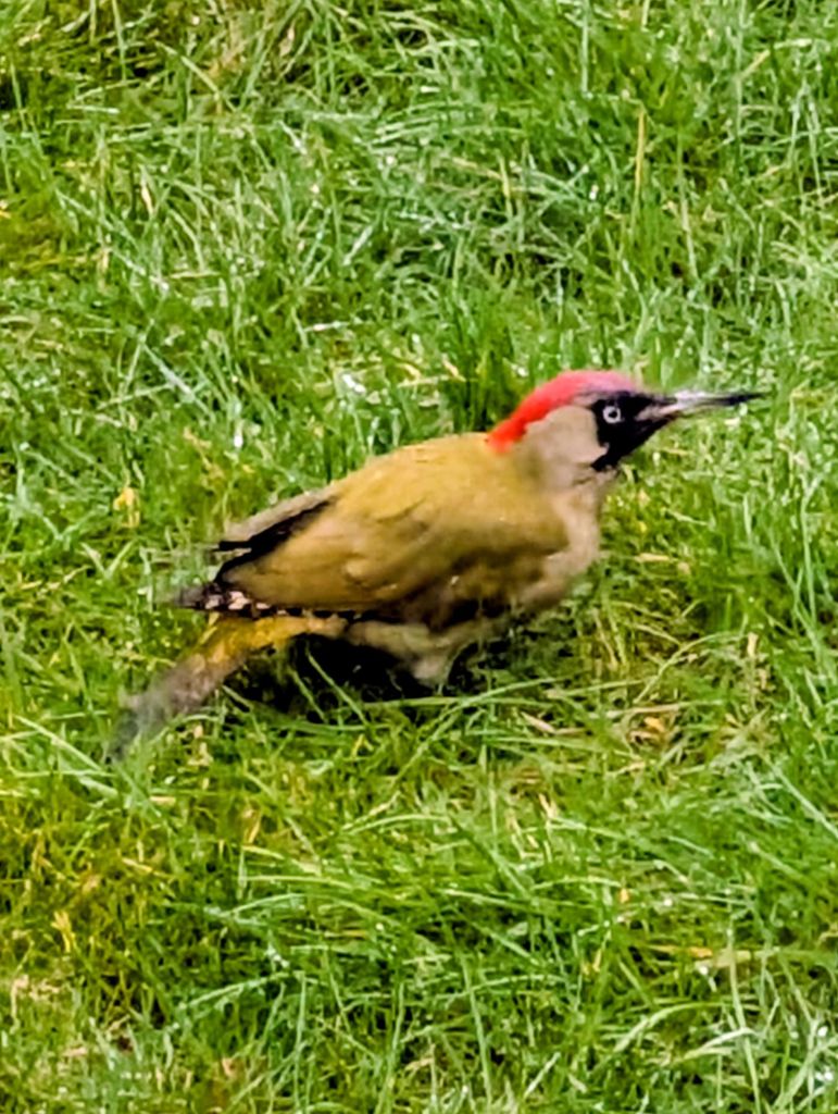 A blackbird was hopping underneath the hedge adjacent to the recreation ground. I left the cemetery and began to walk along the cemetery road. I walked back and looked into the Pitbull’s garden to see him standing on all four legs on the trampoline, looking extremely alert.