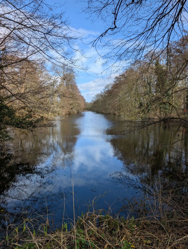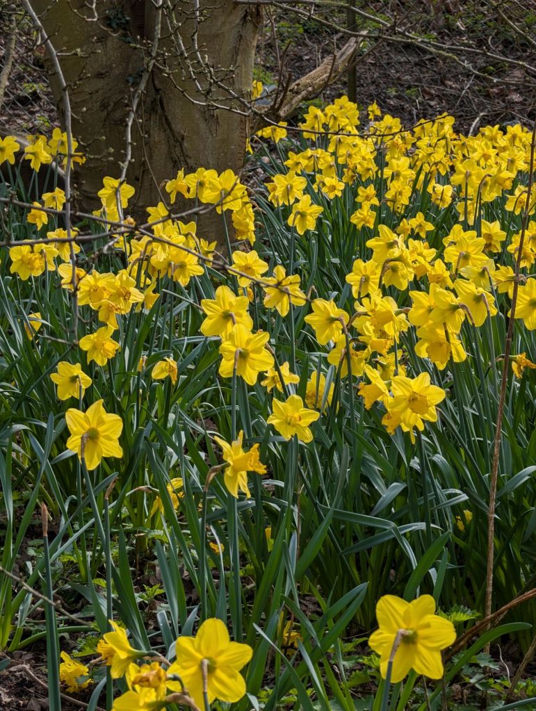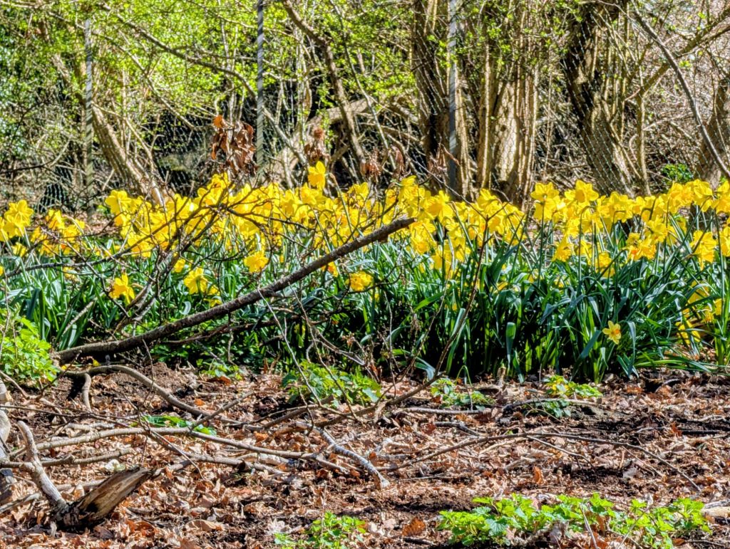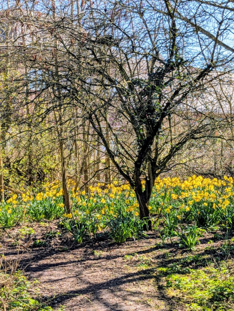 Dazzling yellow daffodils were everywhere, mostly growing healthily from bulbs planted by the gardening team—a rich investment with years of beauty ahead.    A couple of grey squirrels raced up the trunks of trees as I approached; they are numerous around here, feeding from the large ancient oaks, beech, and chestnut trees growing around the lake. As I neared the water, I noticed a couple of moorhens racing across the grass as fast as possible on their short legs.