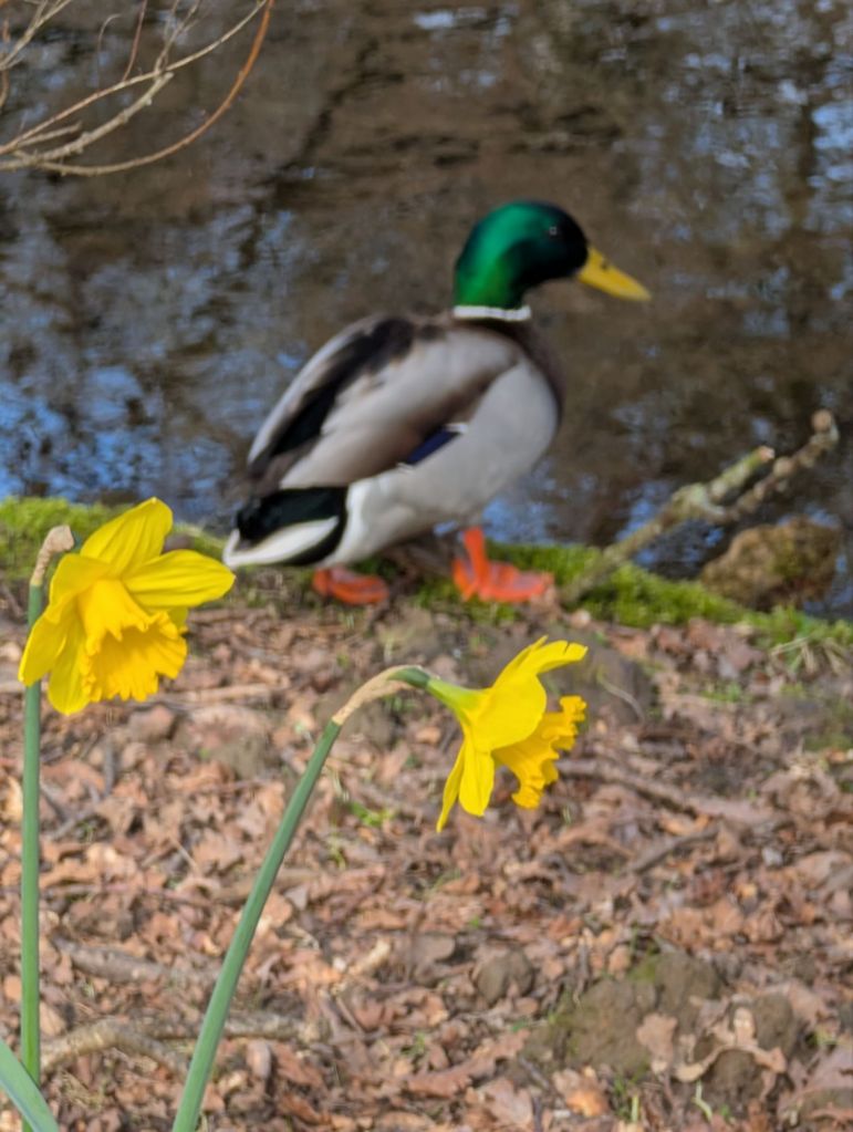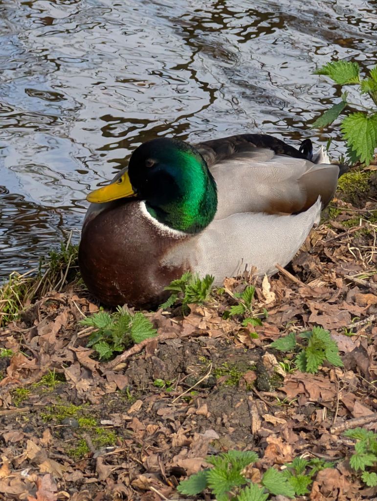 Along the bankside, many wild primroses were just coming into flower. Many mallard ducks, mostly males—conspicuous by the almost luminescent green sheen of their feathers—were soaking up the early afternoon sunshine. I captured a couple of beautiful photographs of one of the males before it slid down the bank into the water.