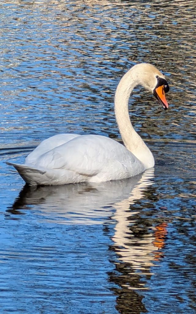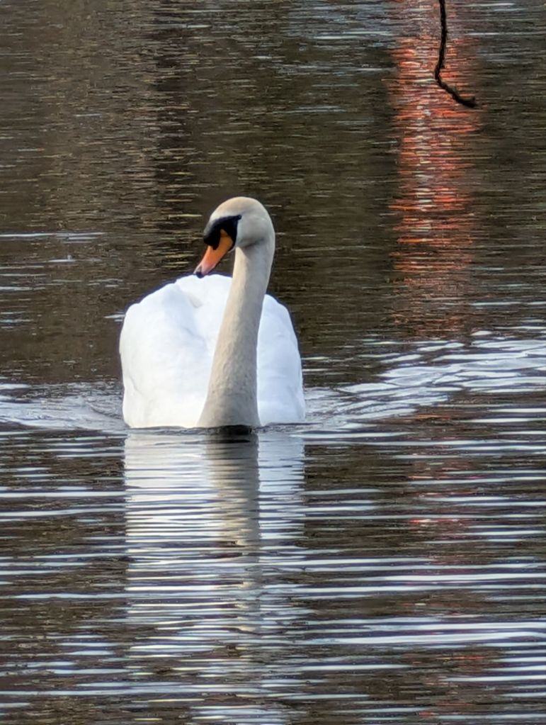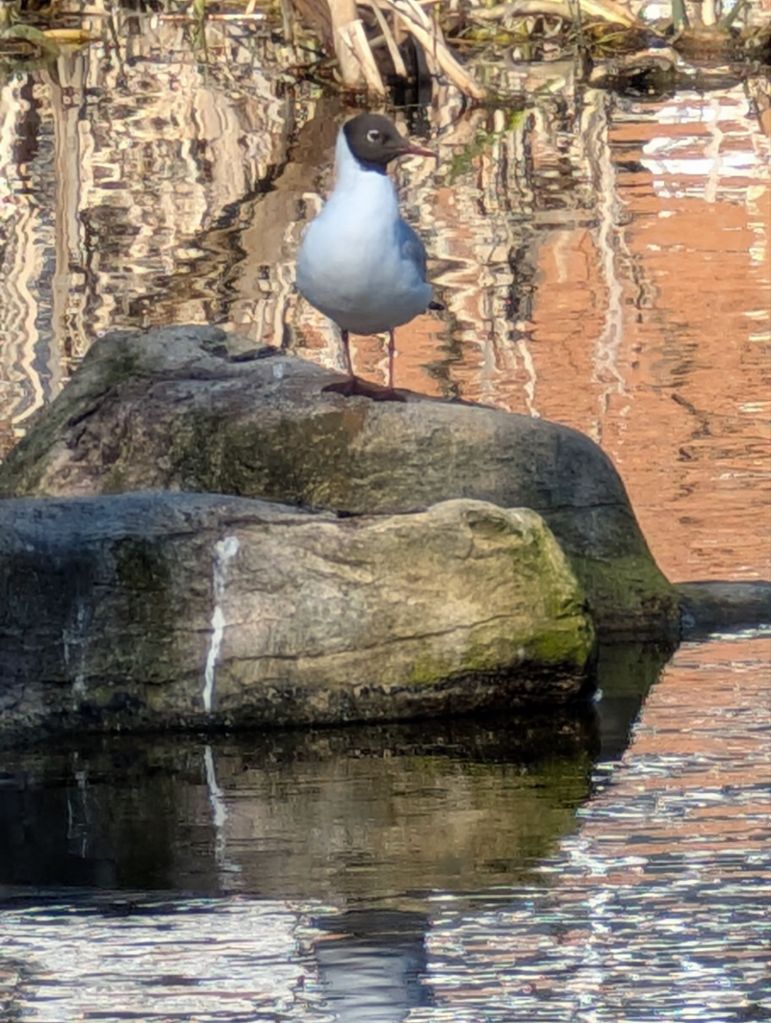 Several mallard ducks floated by on the water’s surface; I photographed one framed by interesting hazel catkins hanging from a bankside tree. I also captured images of a moorhen floating near the edge and a black-headed gull perched on a rock in the centre of the lake. The swans remained busy feeding among the reeds on what seemed to be an inexhaustible supply of food.