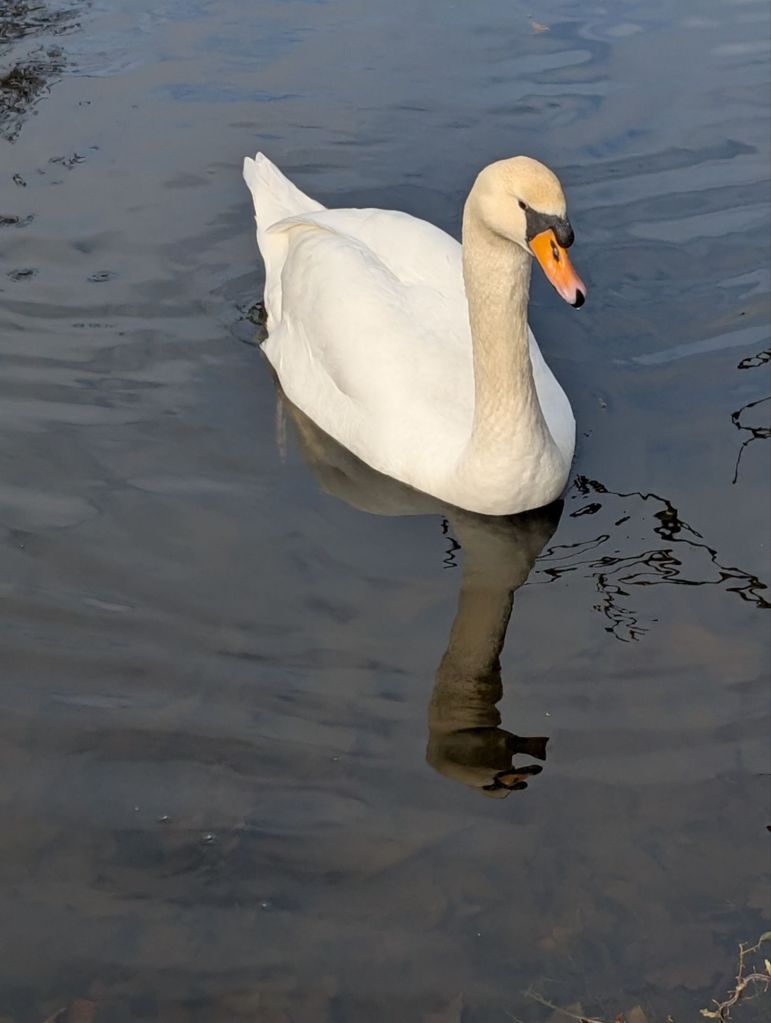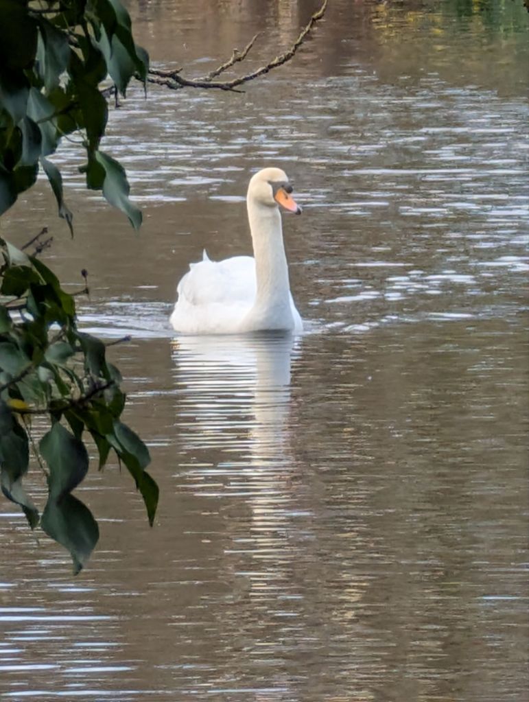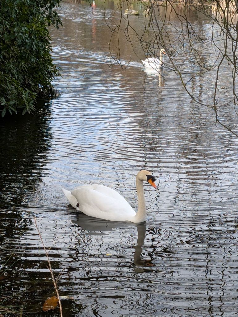 I took a beautiful photograph of the lake and crossed a small bridge to the far side. A few moorhens were swimming around close to the edge of the lakeside. Two majestic swans were floating on the surface, and I managed to take a couple of good pictures of them.