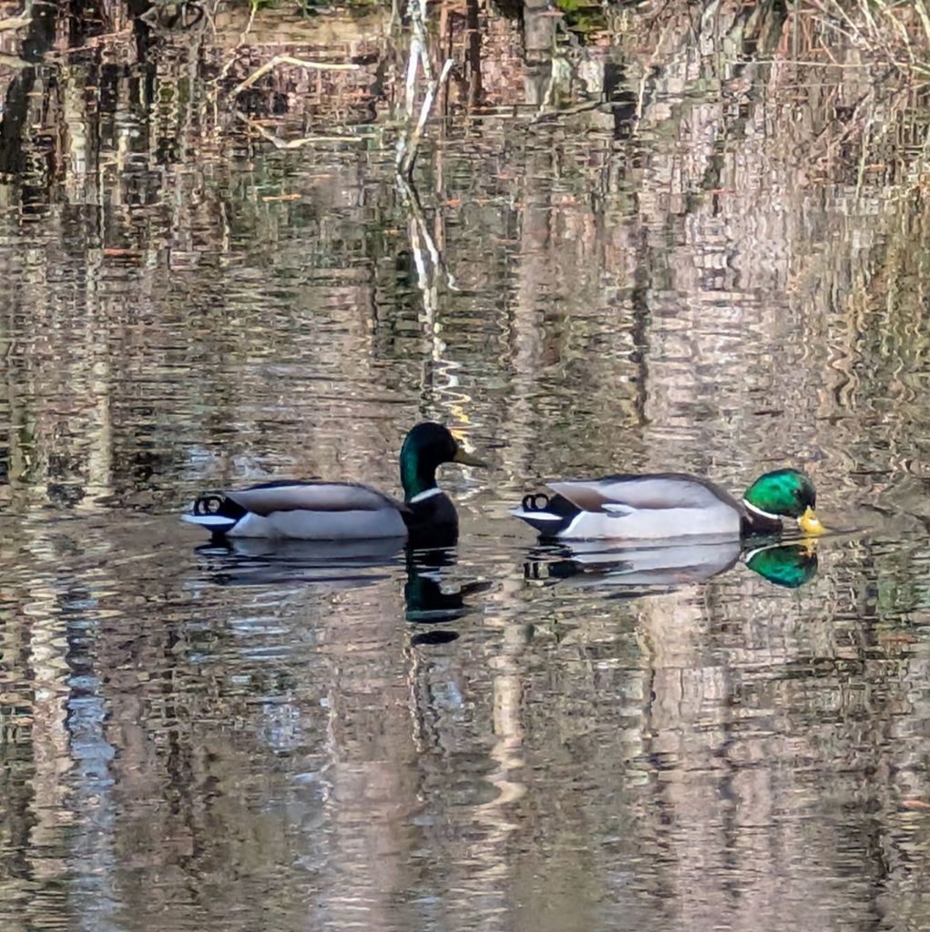 I completed my walk by a small pond, photographing a moorhen and a couple of mallards on the weedy surface.