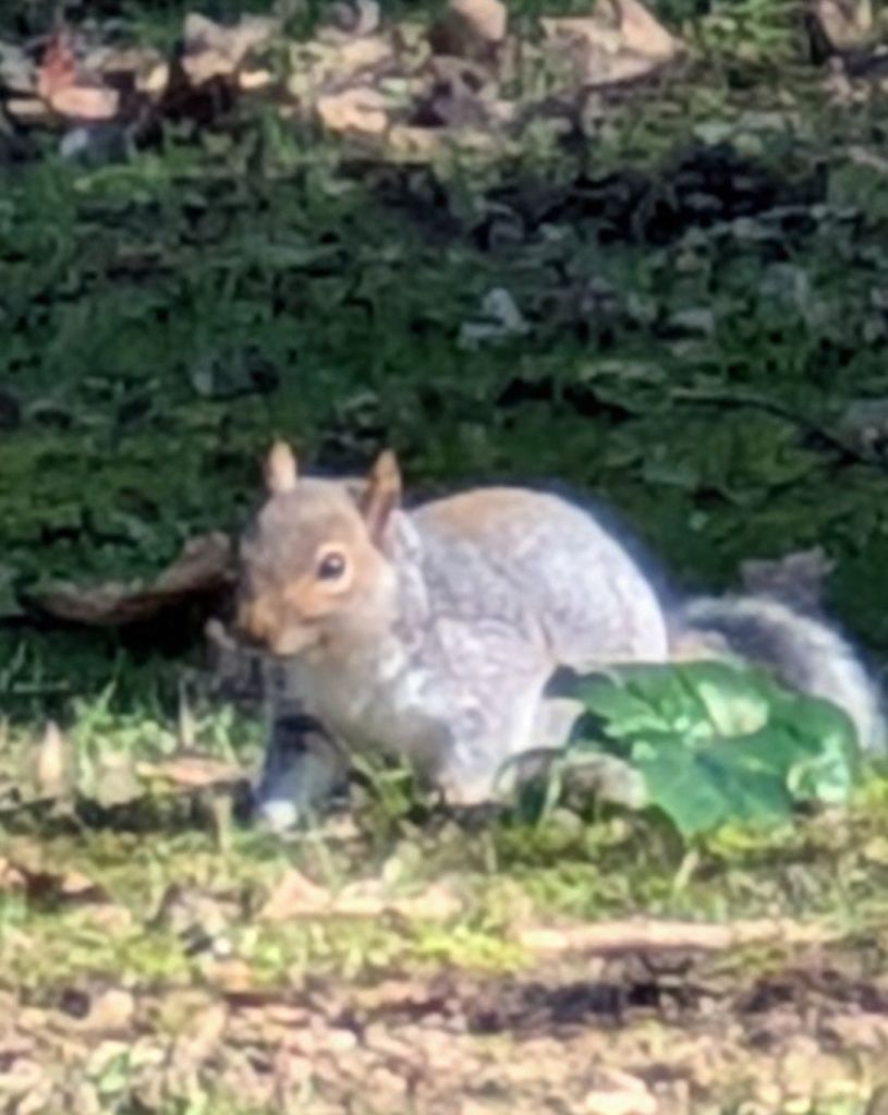 A grey squirrel raced up a tree trunk as I approached, and several small birds flew into the safety of a thick bramble patch.