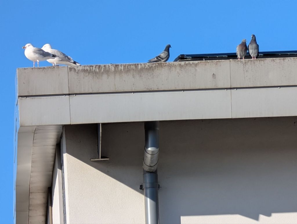 Leisure Centre: I spotted three feral pigeons perched on the leisure centre rooftop.